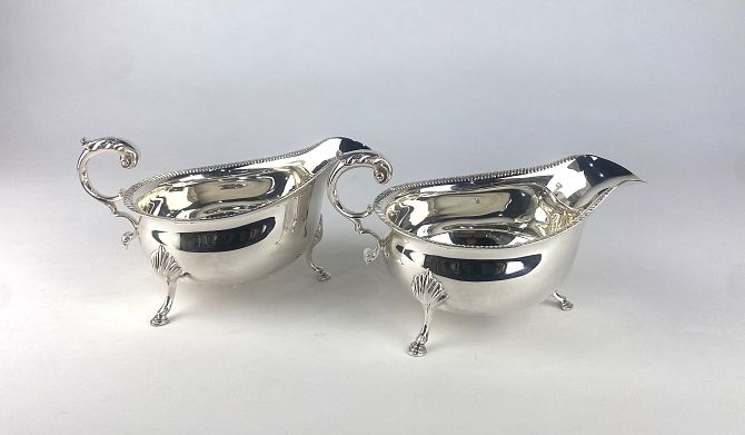 A pair of Edward VII silver sauce boats with flying scroll handles, maker Henry ...