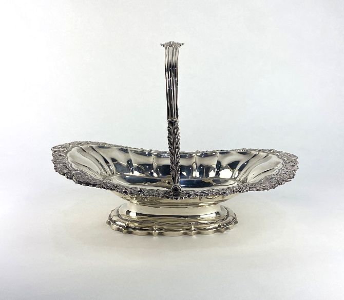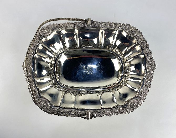 A George IV silver basket, the swing handle unmarked, with scrolling shell cast border, armorial engraved, 34cm long, 33.6oz gross