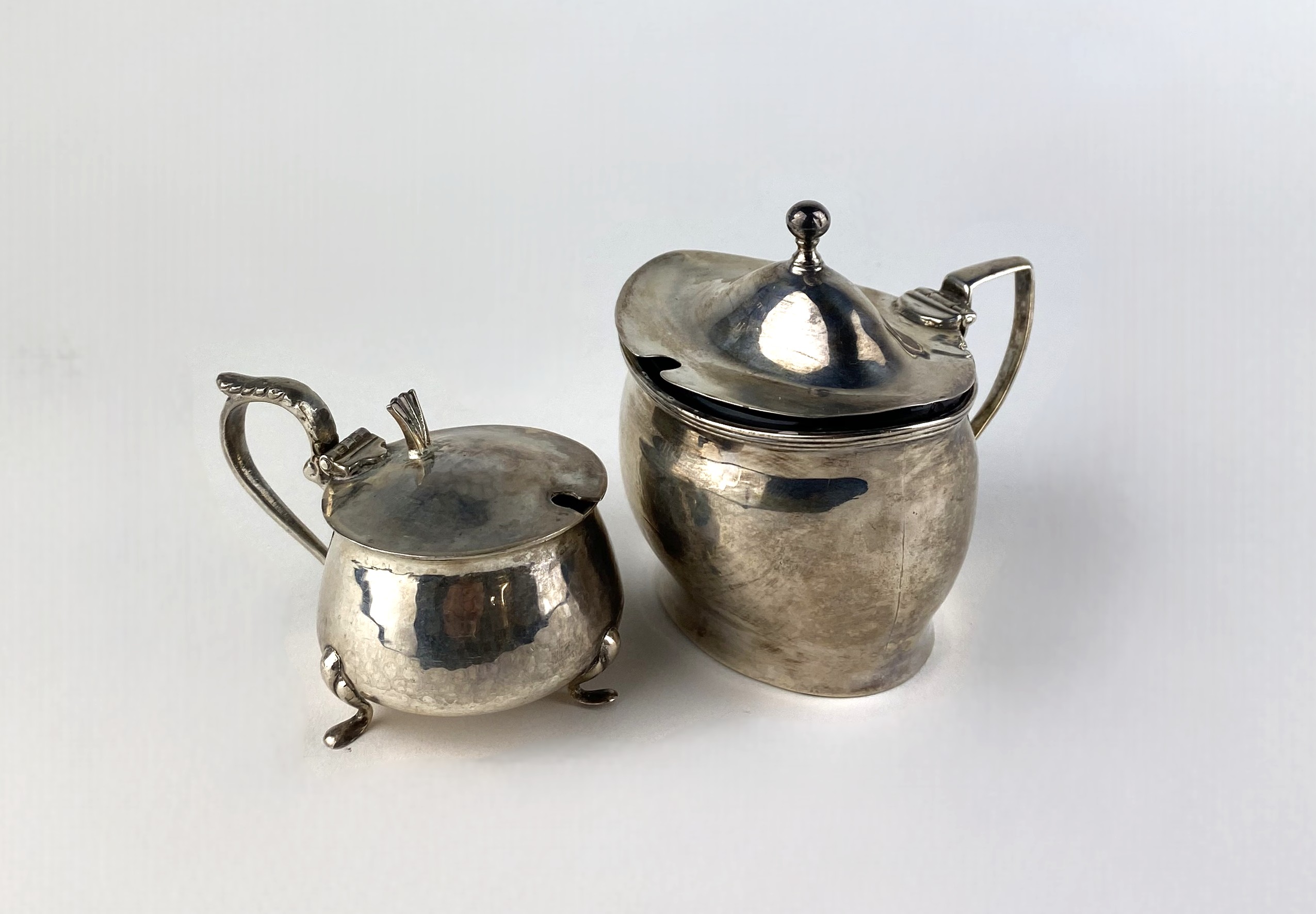 Two silver mustard pots with hinged lids and original blue glass liners, London 1806 and Birmingham 1957, combined weight 5.51oz.
