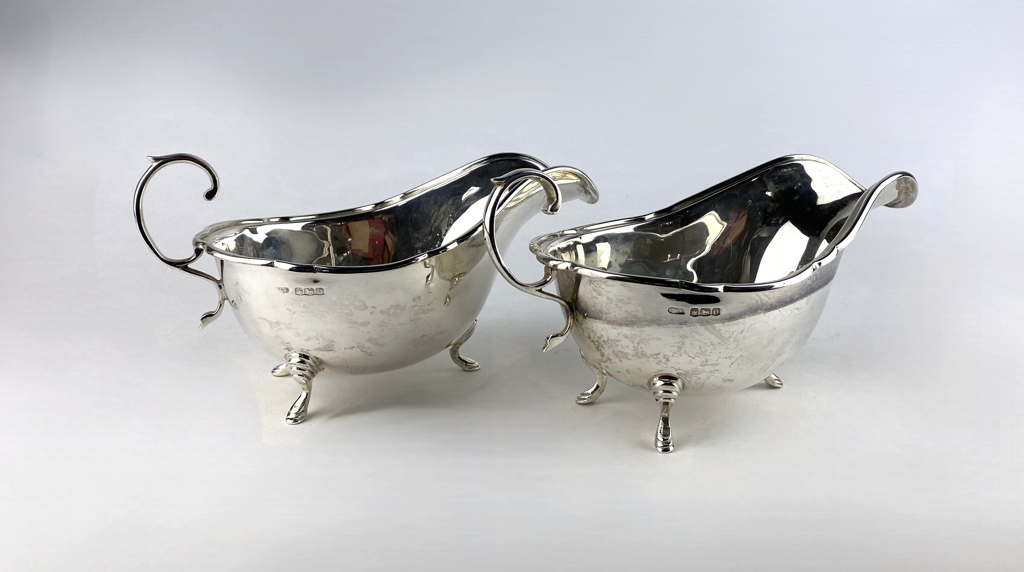 A pair of George V silver sauceboats, maker C W Fletcher & Son Ltd (Charles William Fletcher), Sheffield 1931, each with flying scroll handle on three feet, 10cm high, 20cm long, 14.3oz
