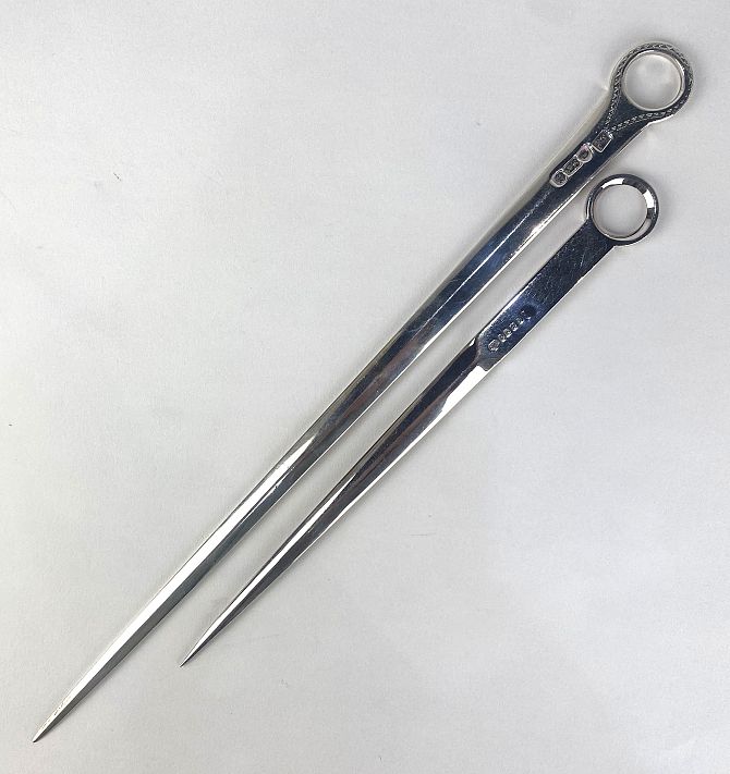 A George III silver meat skewer, by Gabriel Sleath, London, 1782, bright cut engraved, length 32.5cm, 3oz together with a silver plated meat skewer, length 23cm (2)
