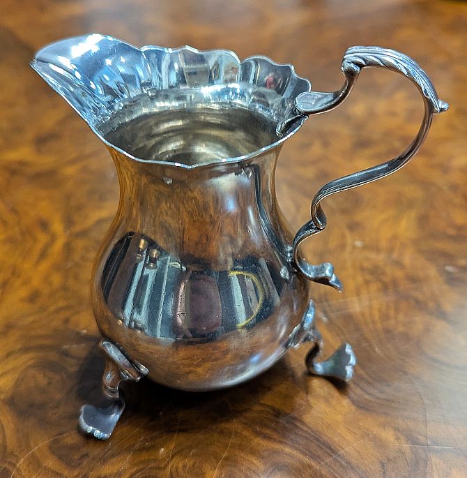 A late Victorian silver cream jug, makers mark J. N. Co, Birmingham, 1895, raised on three feet, with acanthus leaf topped scroll handle, height 9.2cm, 3oz (AF)