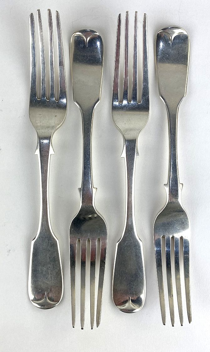 A set of four Victorian silver fiddle pattern table forks, by James Braham (Torquay), Exeter, 1848, length 20.6cm, total weight 9.6oz (4)