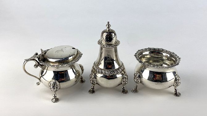 A George V silver three piece condiment set, in the neo classical style, by Mappin & Webb Ltd, London, 1934, including pepper pot, mustard pot (cover detatched) and salt cellar, with gadrooned rims, each raised on scallop shaped feet with female masks, engraved with unicorn crest, pepper pot height 10.5cm, total weight 9.9oz