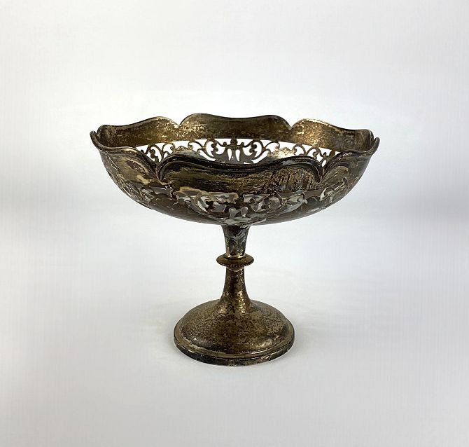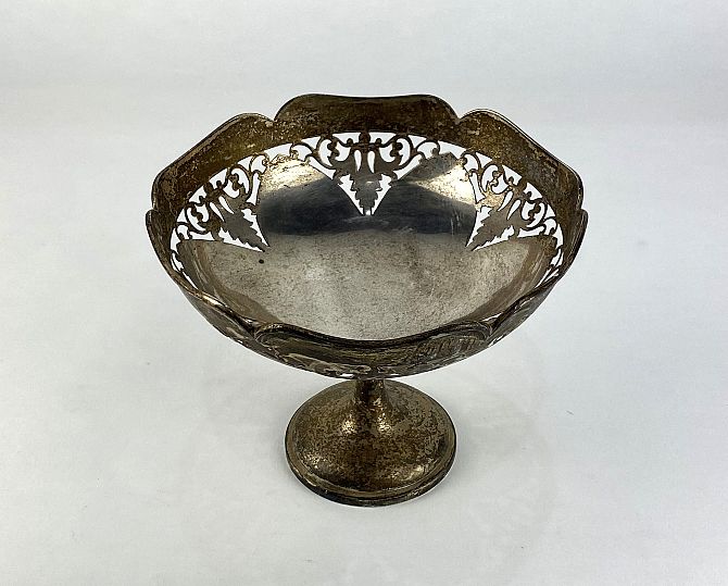 A George V silver pedestal bowl on circular foot, maker Walker & Hall, Sheffield 1915, with lobed rim and pierced scrollwork design, 14.5cm high, 17.5cm diameter, 12oz