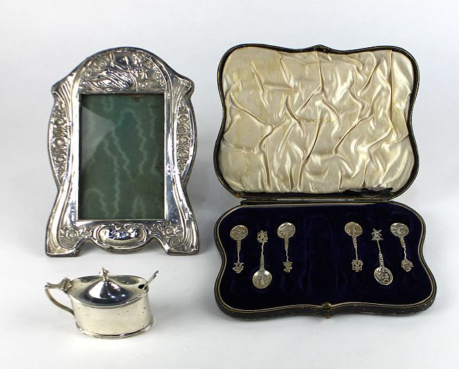 An Edwardian silver mustard pot, in the George III style, Chester, 1906, makers mark worn, with blue glass liner, height 7.3cm, 2.9oz, with stainless steel spoon, together with an Edwardian Art Nouveau silver photo frame, by Samuel L. Levi, Birmingham, 1906, height 22cm (AF), and a set of six .800 white metal spoons, cast with finials in the form of figures, windmill and ship, height 8cm with an associated case