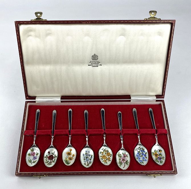 A set of eight Elizabeth II silver and enamel teaspoons, each decorated with different flowers to the bowl, maker S J Rose & Son, Birmingham probably 1971, 3oz, in fitted Mappin & Webb case