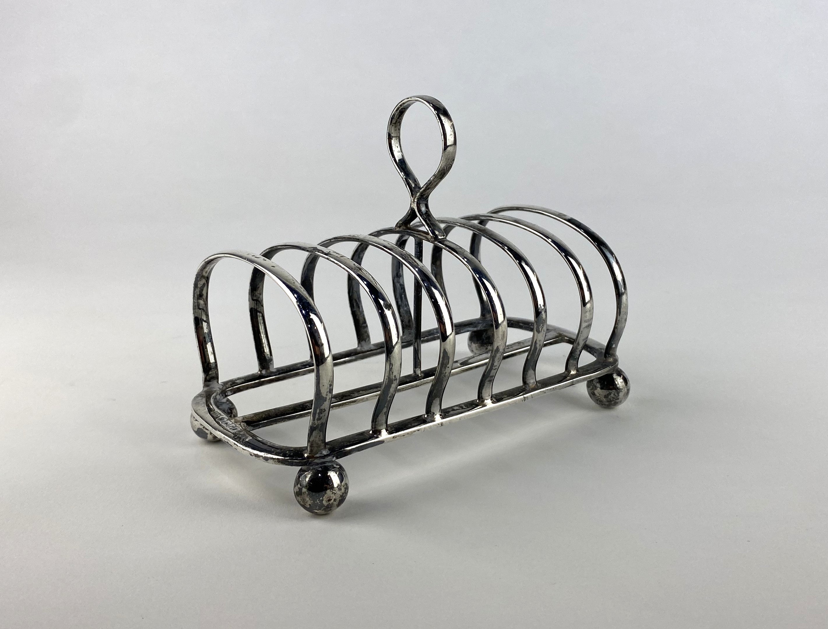 A George V silver toast rack, by Mappin & Webb, Sheffield, bearing Jubille hallmark, 1934, additionally stamped 'Mappin & Webb Ltd., Sheffield & London', on bun feet, width 15cm, 9.8oz