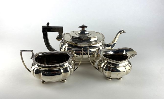 A George V silver three piece teaset, maker S Blanckensee & Son Ltd., comprising teapot, Birmingham 1918, and milk jug and sugar bowl, Birmingham 1919, all with gadrooned rim, on ball feet, combined gross weight 31.2oz