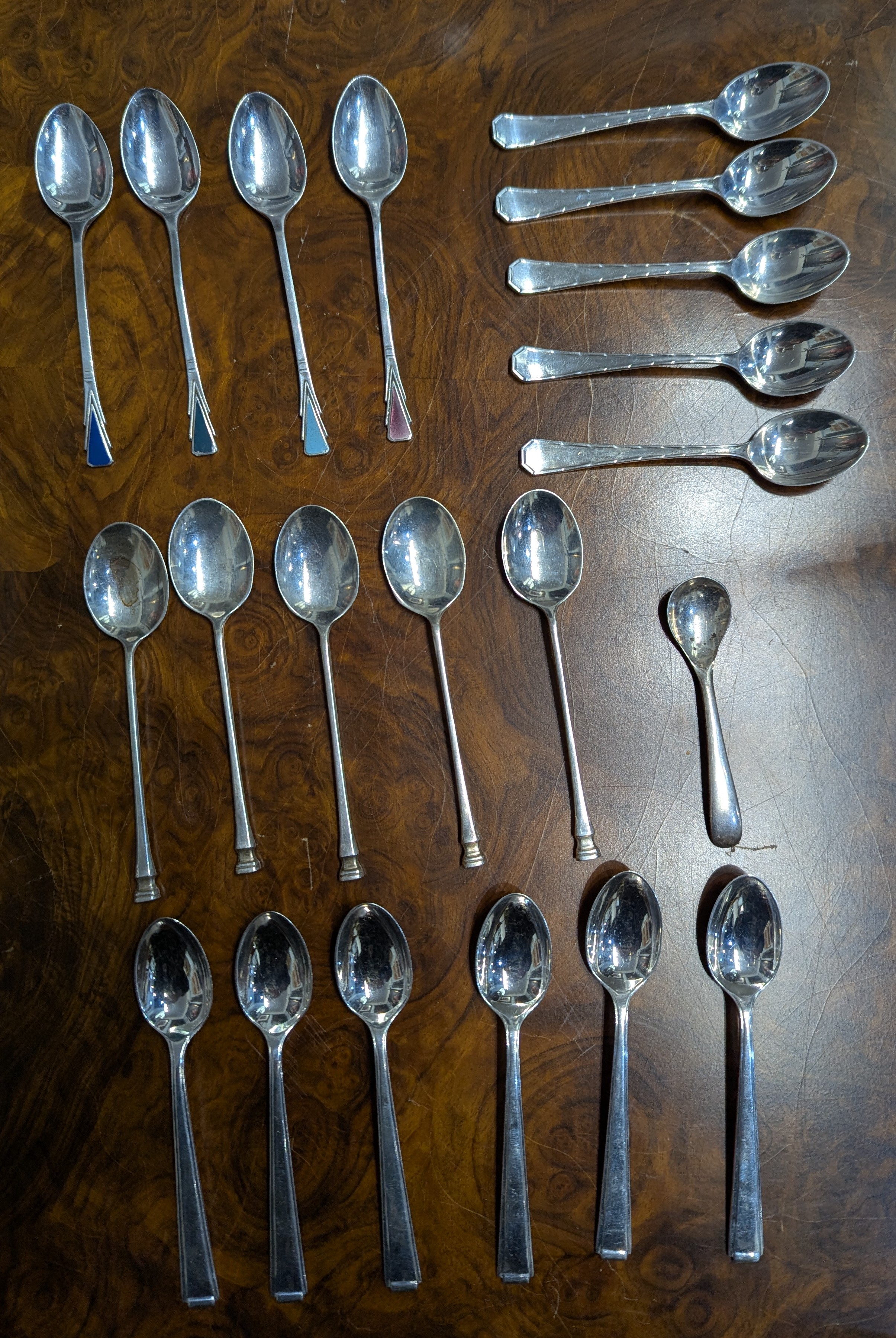 A set of four George V Art Deco silver teaspoons, by Deakin & Francis, with geometric enamel terminals, Birmingham, 1933, together with a set of six modernist silver teaspoons, by Cooper Brothers & Sons, Sheffield, 1958, RdNo920564; a set of five silver teaspoons, by Francis Howard Ltd, Sheffield, 1959, a set of five silver teaspoons, by Atkin Brothers, Sheffield, 1936, Rd808842, and a further silver salt spoon, total weight 5.3oz (21)