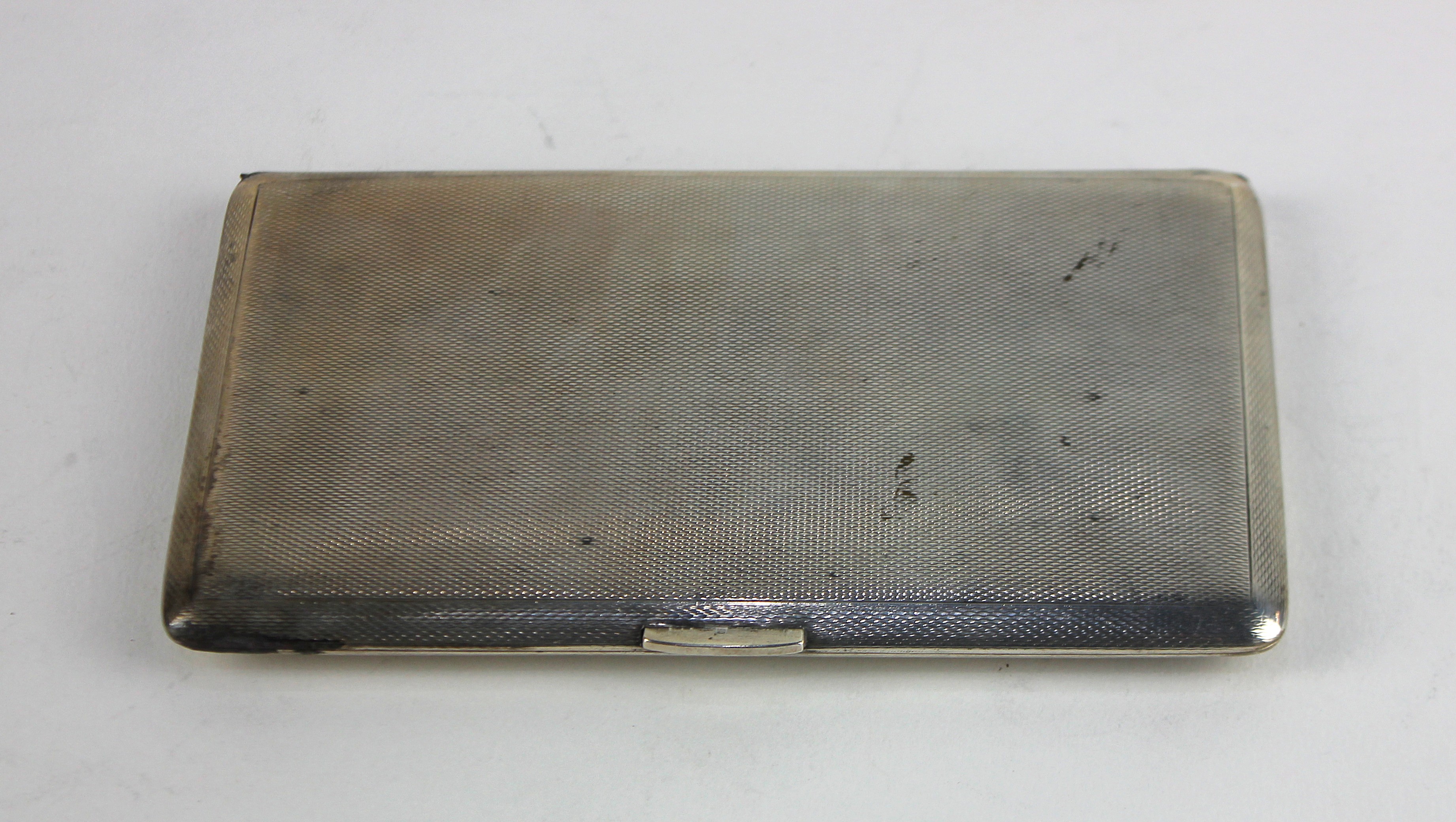 A George VI silver cigarette case, by Dudley Russell Howitt, Birmingham, 1941, engine turned, interior engraved with monogram and date, height 14cm, 7.2oz