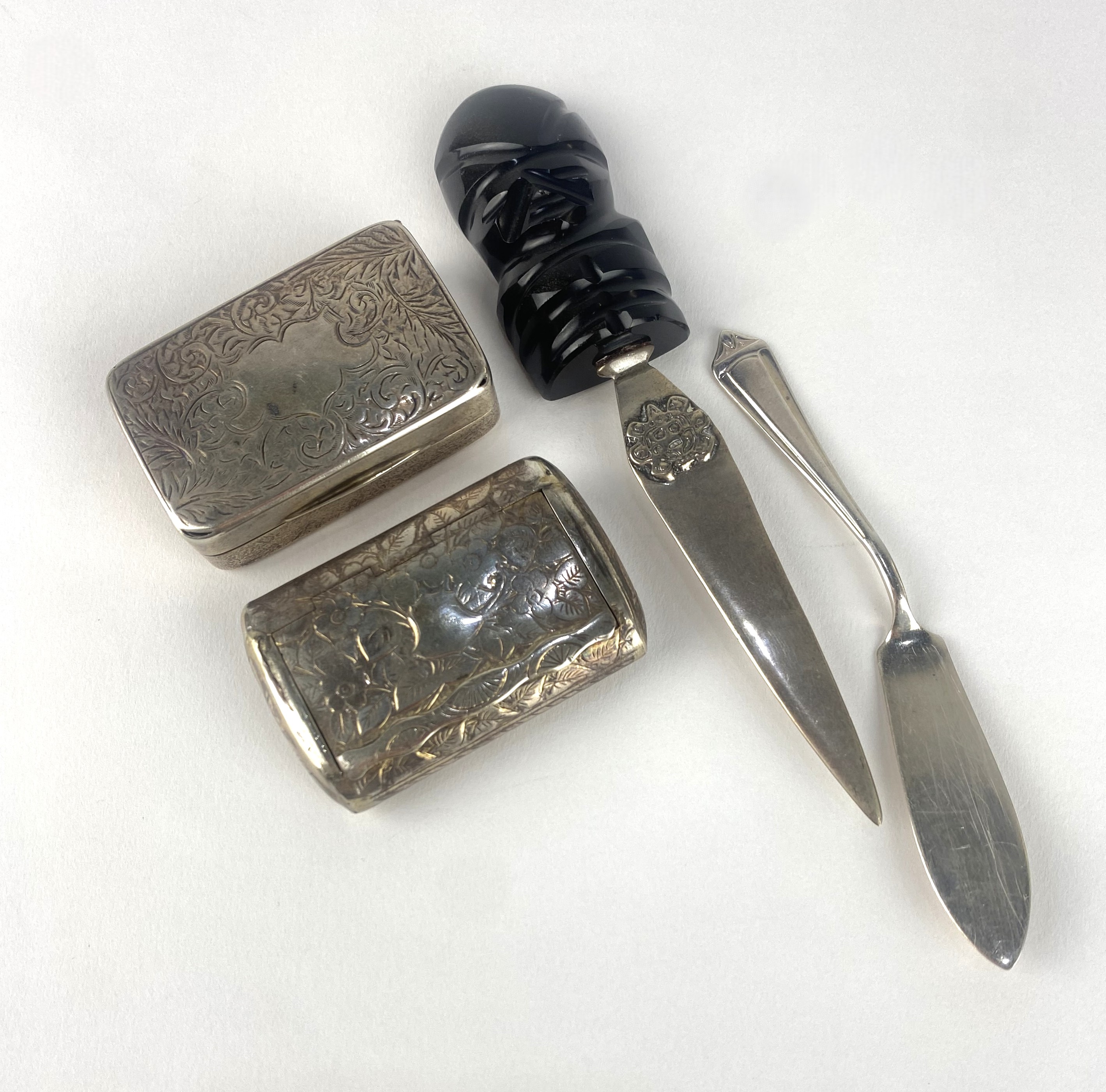 A George V silver snuff box, by John Rose, Birmingham, 1918, lid engraved with scroll and leaf motif around a blank cartouche, gilt wash interior, width 5.5cm, together with a Victorian silver snuff box, engraved with floral and foliate motif, Birmingham, 1884; a Mexican style paper knife with handle in the form of a carved stone figure, blade marked .925, length 14.5cm and an Elizabeth II silver knife, Birmingham, 1959, total weight excluding knife 2.9oz (4)