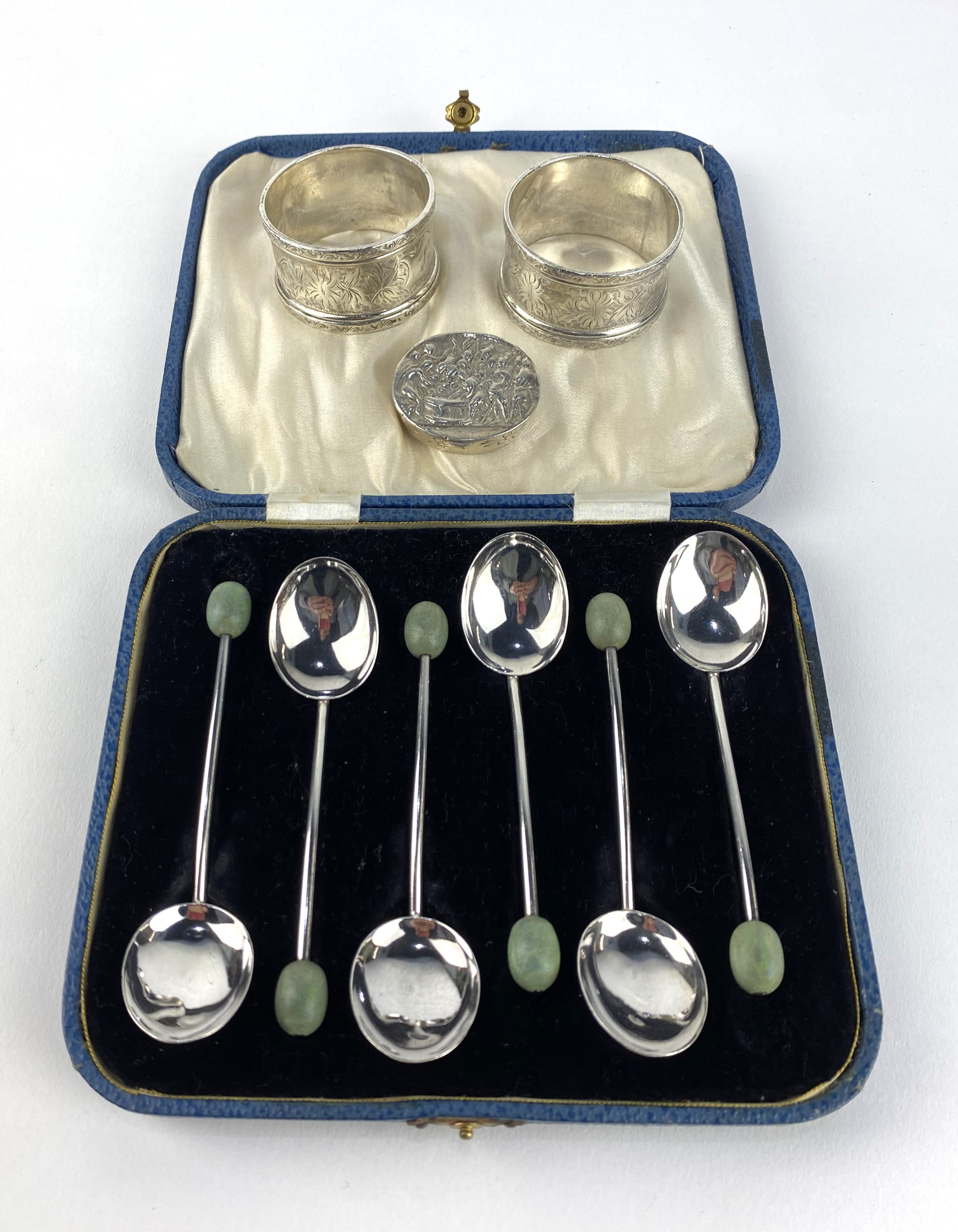 A set of six George V silver coffee spoons with green coffee bean finials, Birmingham 1931, and case, with two silver napkin rings, marks worn, combined gross weight 2.7oz, and a small white metal pill box with gilt interior
