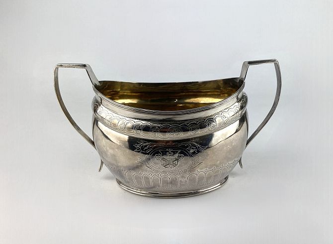 A George III silver twin handled recepticle, marks rubbed, 12cm high by 21cm wide, 9.88oz.