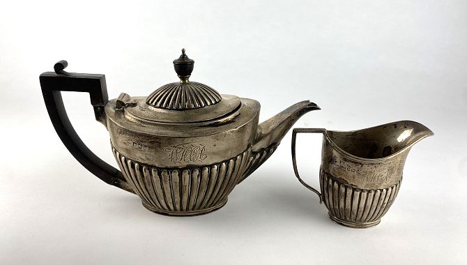 A Victorian silver oval teapot and milk jug, Sheffield 1894, monogram engraved, with half gadrooned body, combined gross weight 21.3oz