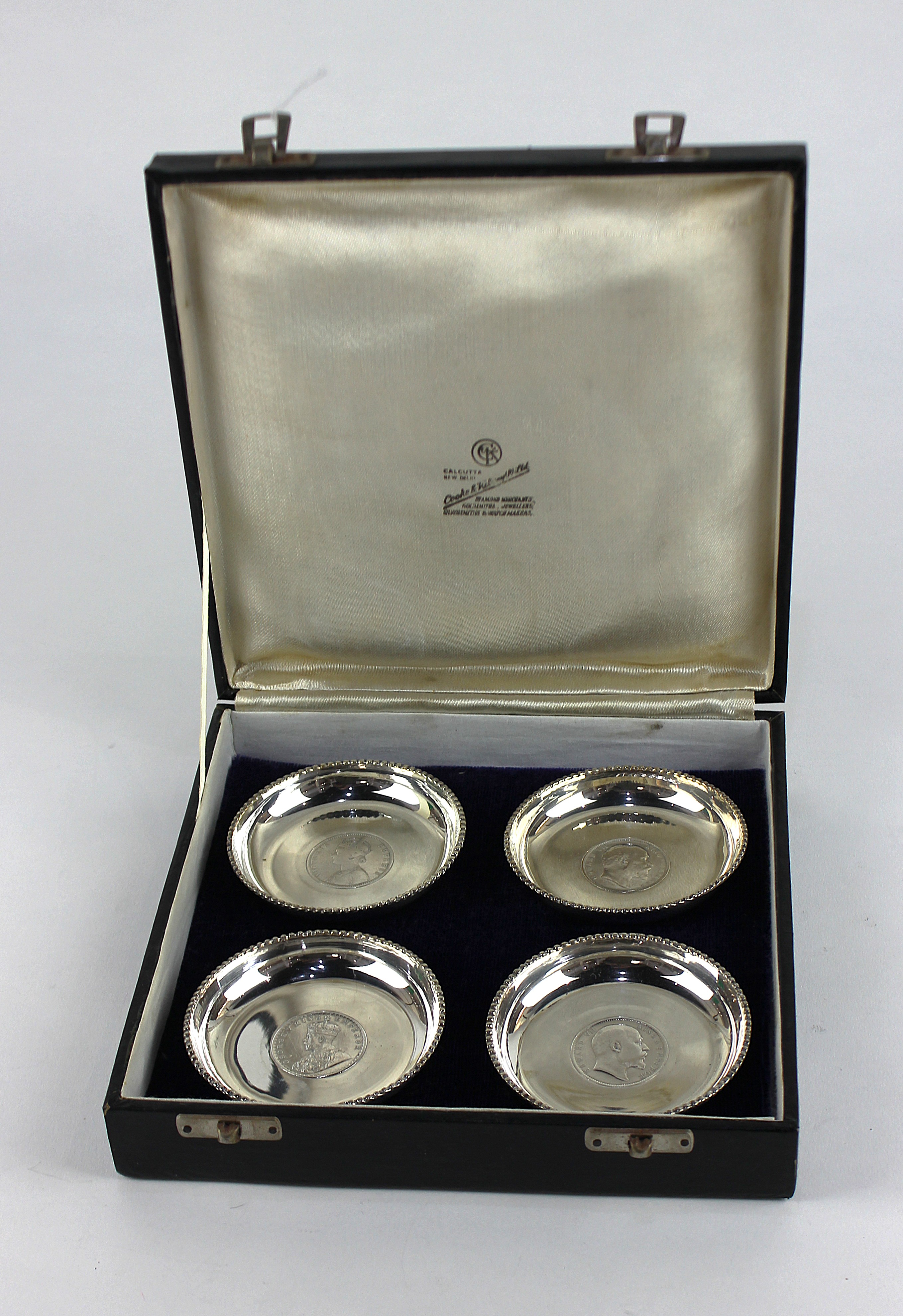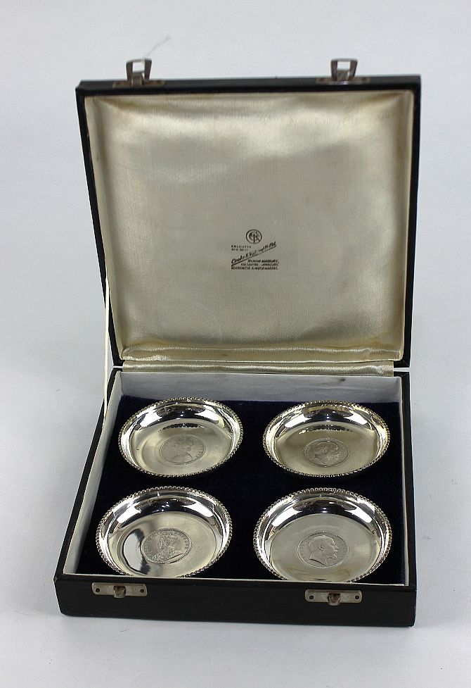 Four Indian circular dishes, each mounted with a differing one Indian rupee within a beaded rim, sample diameter 8.2cm, detailed silver, combined weight 227g, with a case.