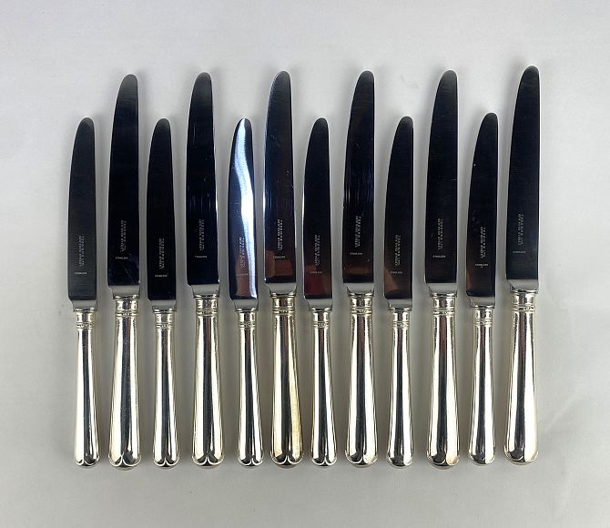 A set of six Elizabeth II silver handled dessert knives and six Elizabeth II silver handled dinner knives, by C.J. Vander, stainless steel blades by Tessiers Ltd., Sheffield, 1973, dinner knife length 24.5cm, gross total weight including blades approximately 24oz (12)