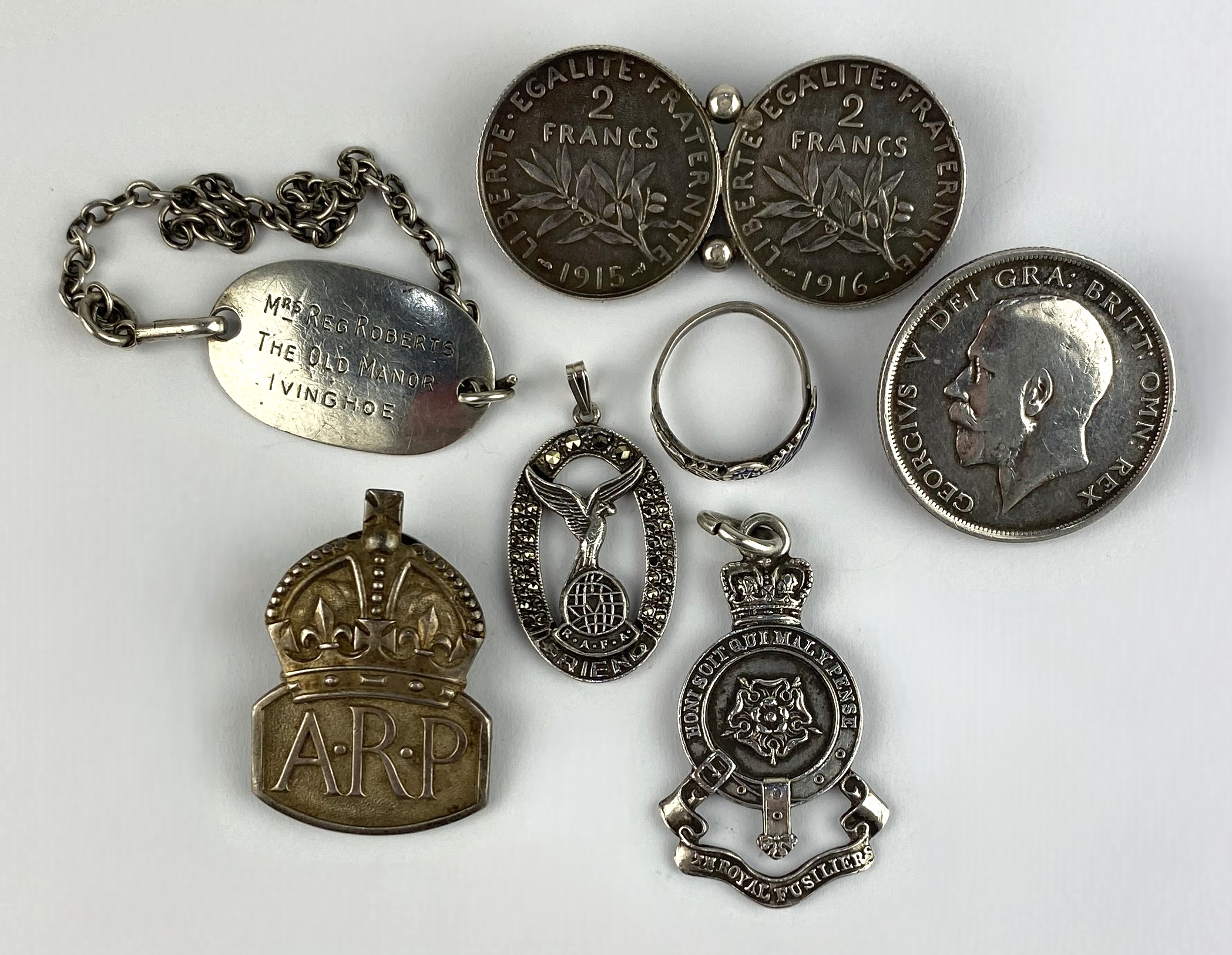 An Irish silver fob medal for The Royal Fusiliers, a silver ARP badge, London 1939, an RAF ring and other items