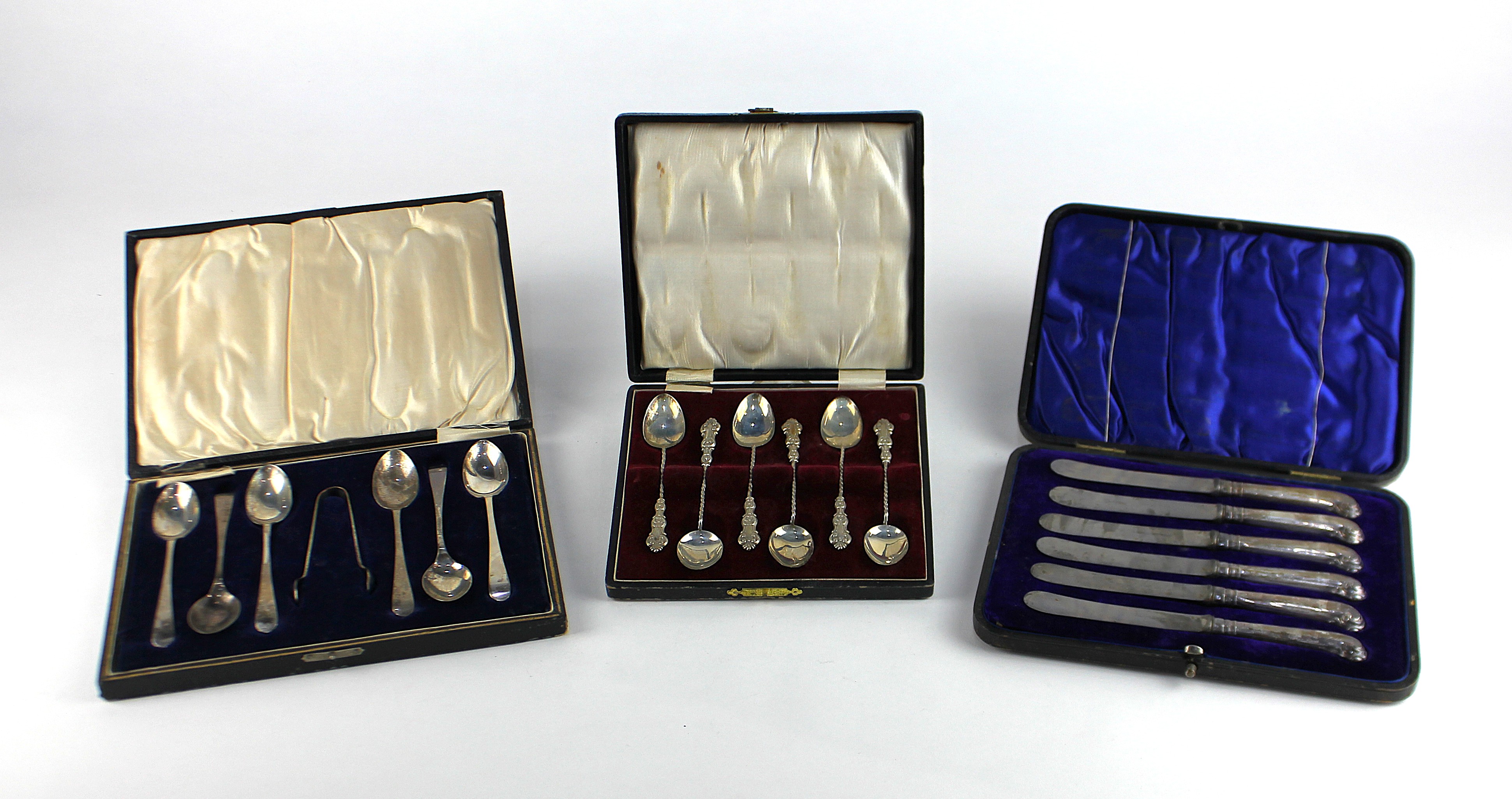 A George V cased set of six silver teaspoons and sugar tongs, by John Batt Ltd., Sheffield, 1918, 2.4oz, together with a George VI case set of six silver coffee spoons, by A.J. Bailey, Birmingham, 1911, 0.8oz and a case set of silver handled butter knives, by Leversley Bros., Sheffield, 1918 (3 cases)