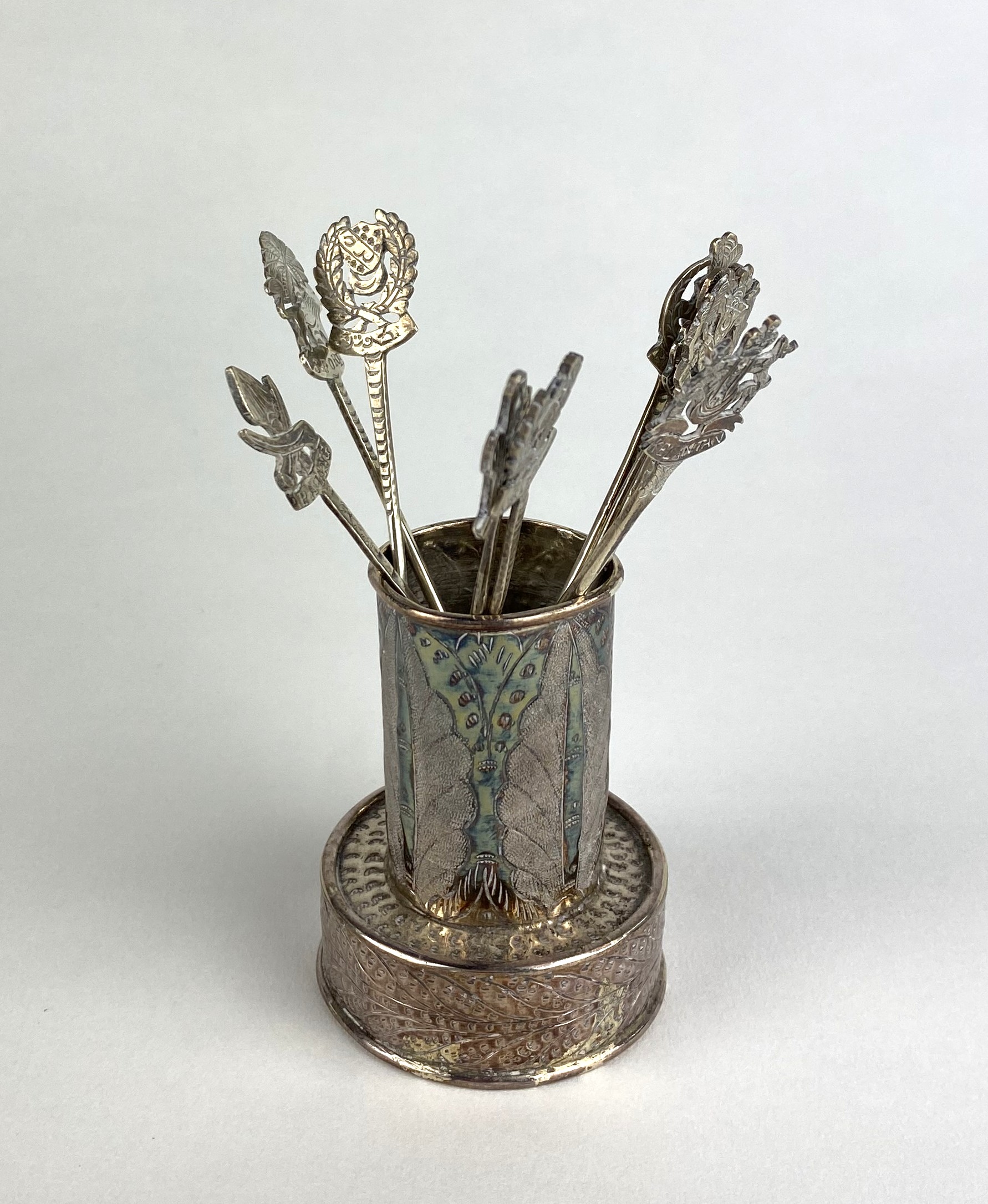A set of nine Malaysian white metal cocktail sticks, 9cm high, each bearing a Malaysian place name, contained within a white metal stand, 6.5cm high, combined weight 2.15oz.