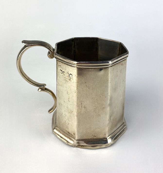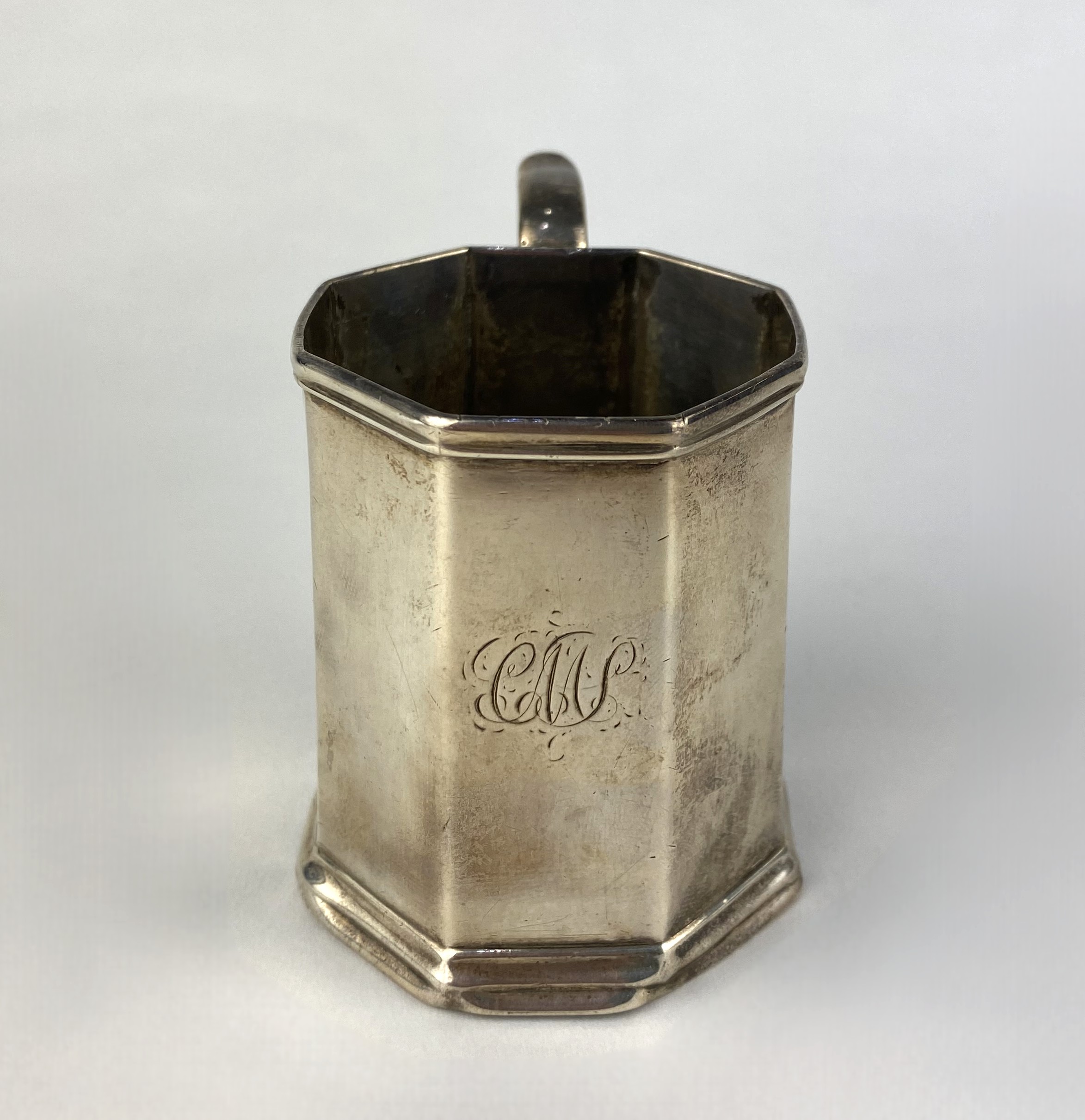 A Victorian silver mug, marks worn, London, 1861, of octagonal form, with scroll shaped handle, monogram engraved, height 7cm, 3.2oz