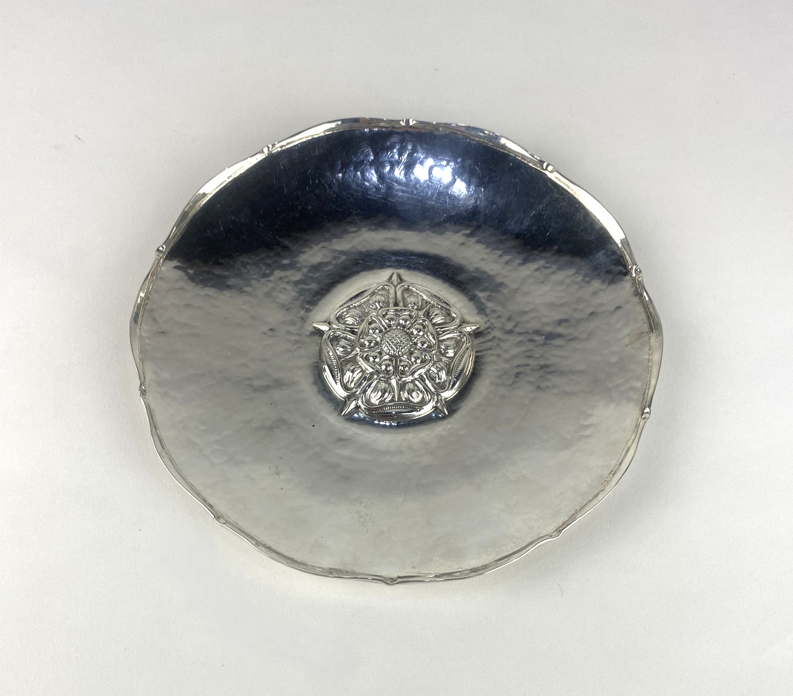 An Arts & Crafts silver rose dish by Omar Ramsden, George V, London, 1929, hammered decoration around a central raised Tudor rose, engrave to base 'Omar Ramsden Me Fecit', 15.5cm, 4.5oz