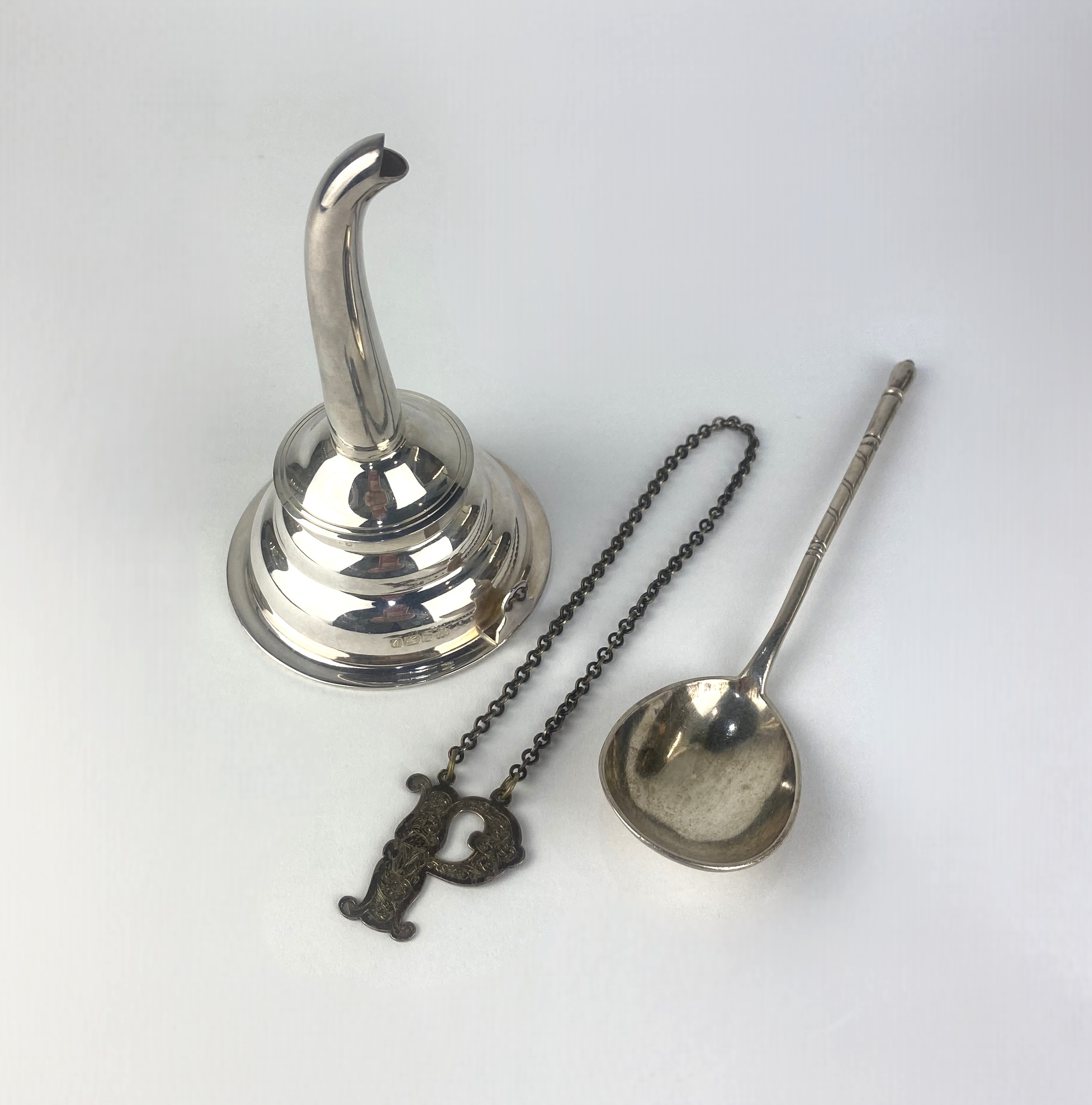 An Elizabeth II silver wine funnel, maker C J Vander Ltd, Sheffield 1995, 3.6oz, together with a silver letter P decanter label on chain, and a Russian white metal spoon