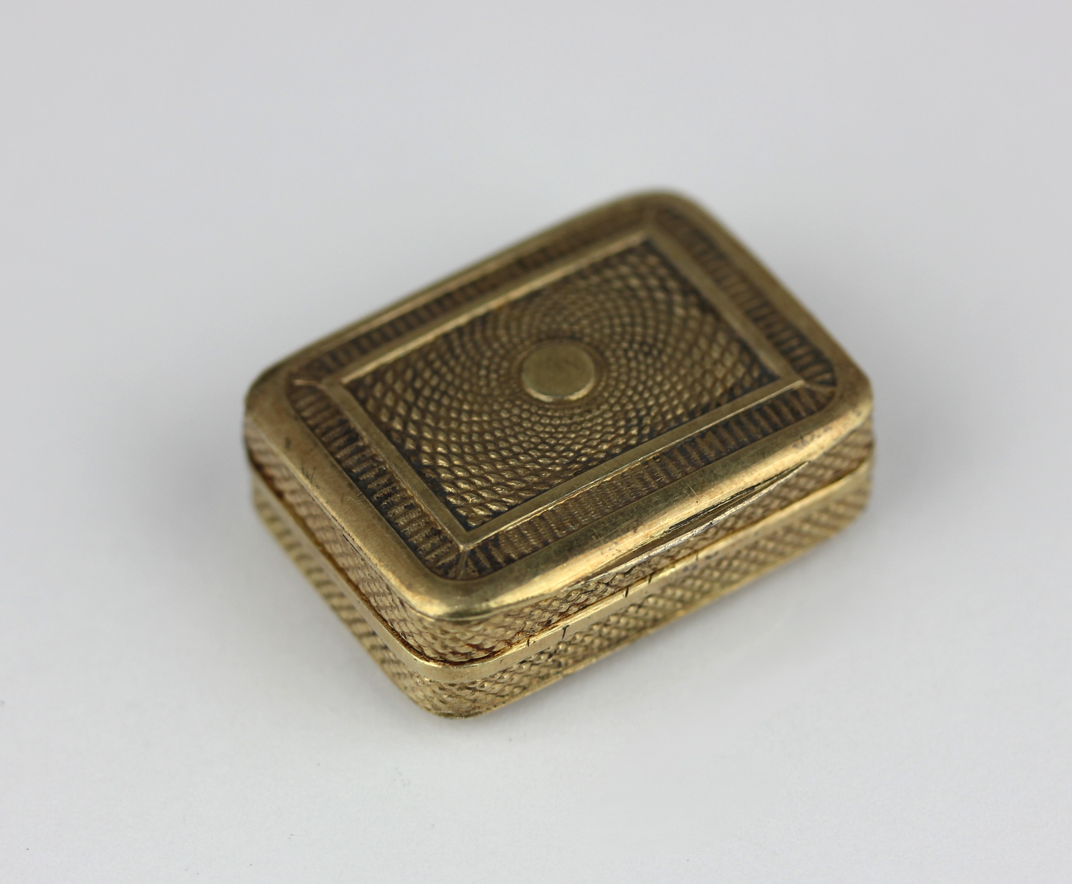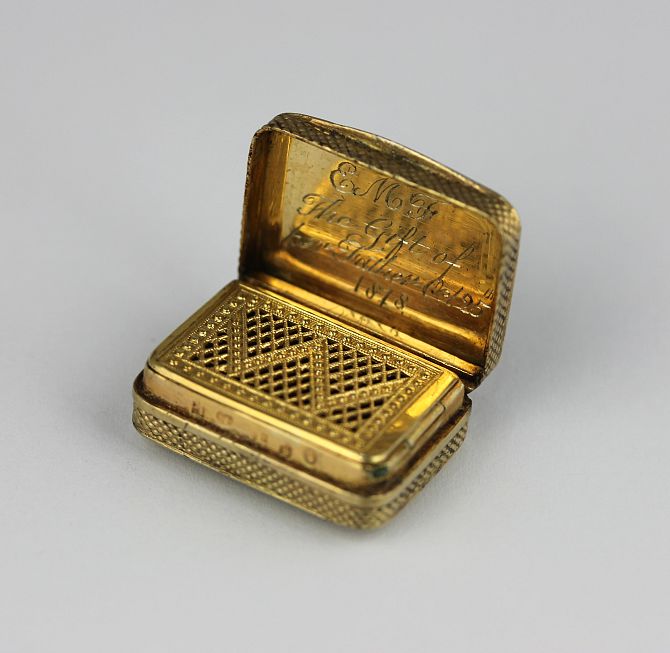A George III silver gilt rectangular vinaigrette, the grill in a pierced zig zag design, the exterior engine turned, presentation inscribed within, 19.6g