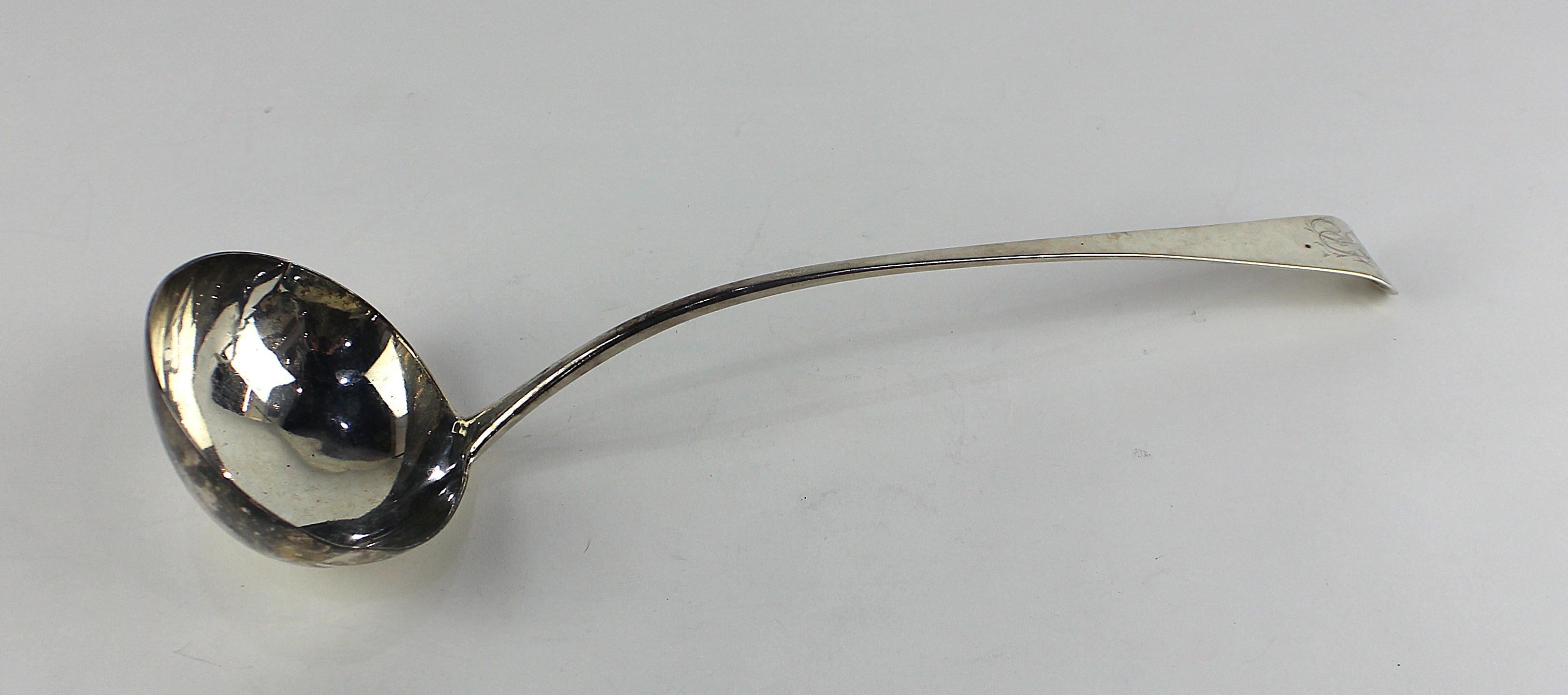 A George III silver ladle, possibly William Sumner, London, 1804 or 1805, monogrammed, length 33cm (AF) 5.7oz