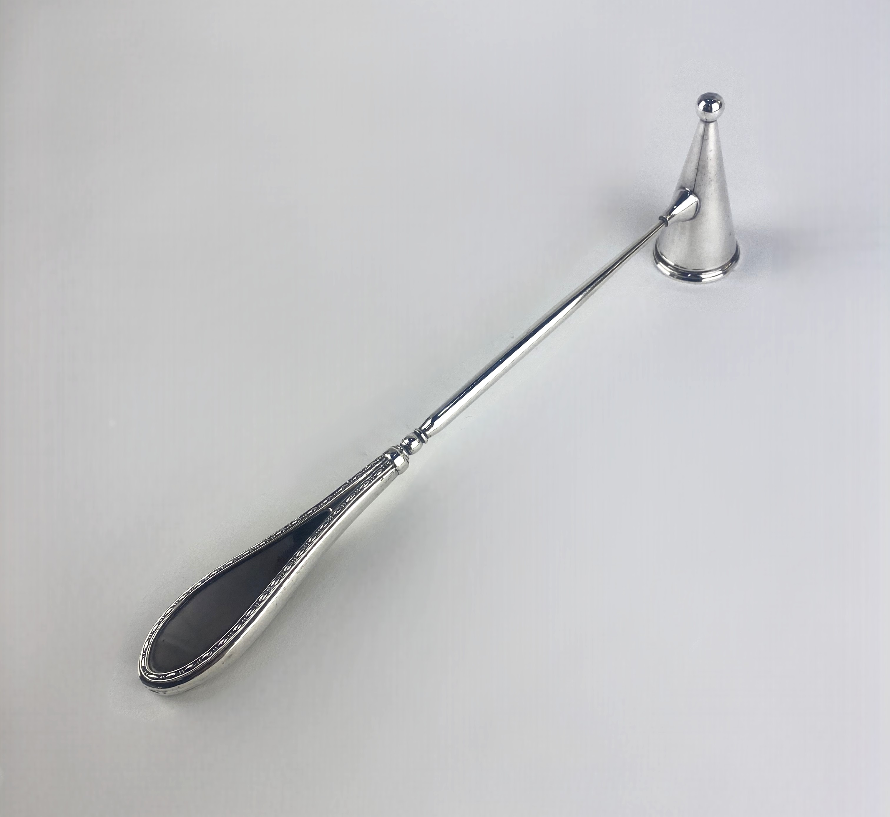 A George V silver candle snuffer, handle marked London, 1927, makers mark worn, inset with tortoiseshell effect inlay (snuffer unmarked), length 26.5cm, 2.8oz