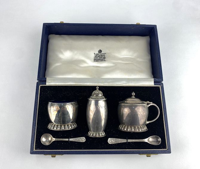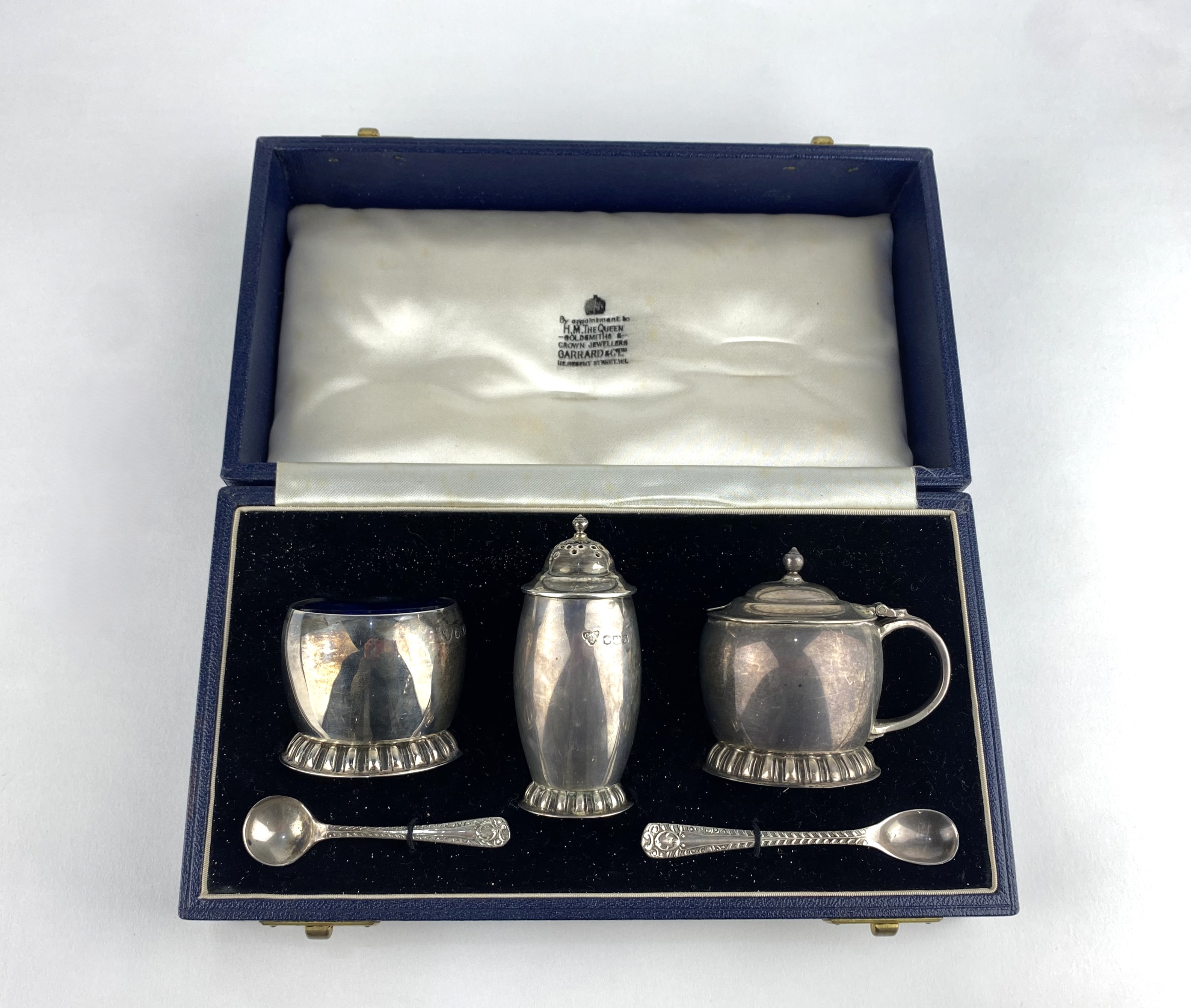 An Elizabeth II cased silver condiment set by Garrard & Co., Sheffield, 1960, comprising; pepper shaker, salt cellar, mustard pot, with blue glass liners, and two spoons, engraved to base, within fitted case interior labelled 'By appointment to H. M. The Queen, Goldsmith's & Crown Jewellers, Garrard & Co. Ltd, 112 Regent St., W1', 6oz