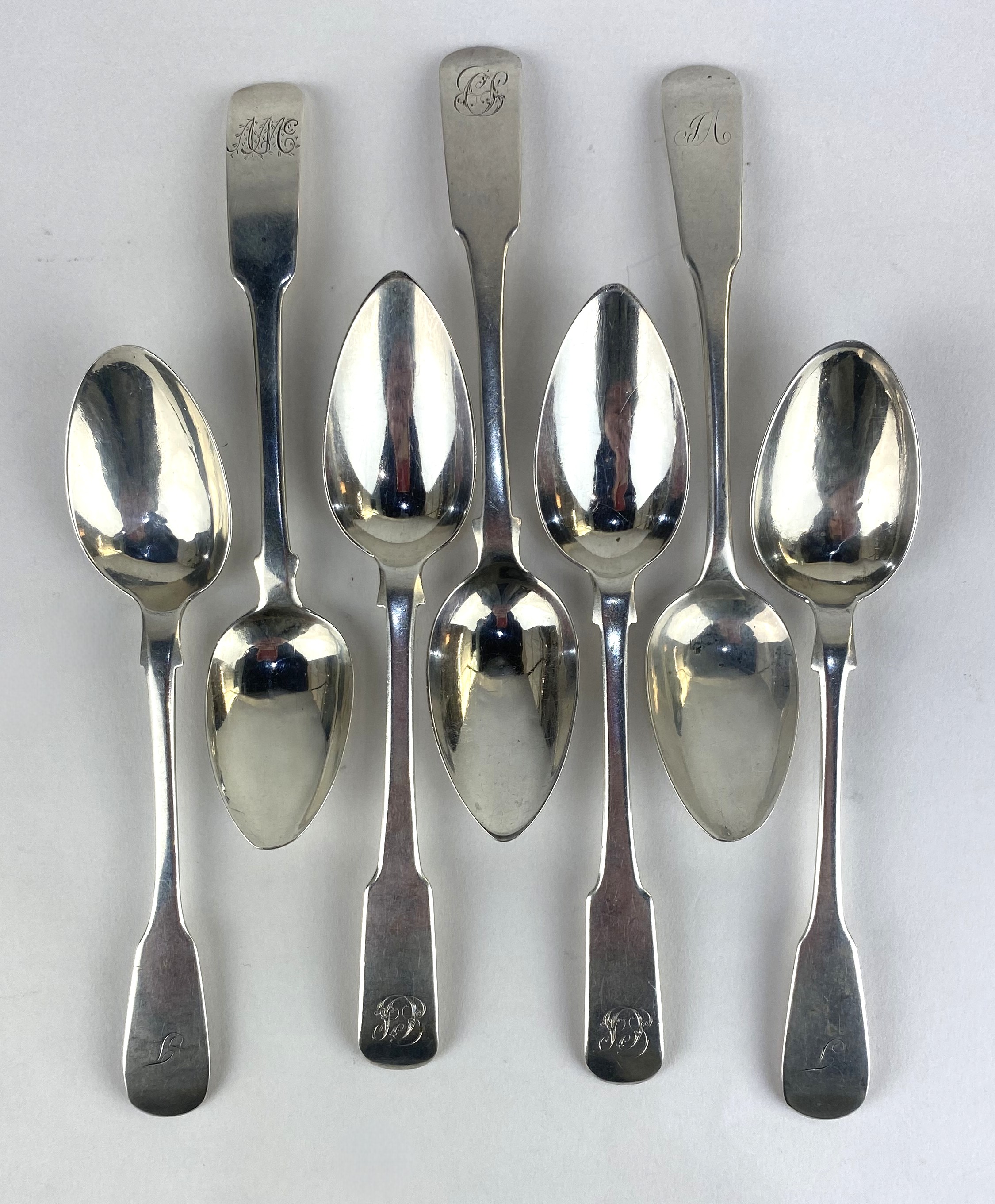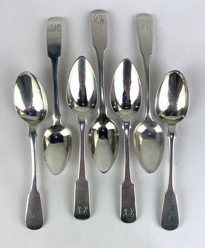 A collection of seven Scottish silver teaspoons, George III to Victoria, including; three George III silver teaspoons, by William Marshall, Edinburgh, 1811, fiddle pattern; together two fiddle pattern teaspoons, by Andrew Wilkie, Edinburgh, 1844 and two Georgian teaspoons, total weight 3.9oz (7)