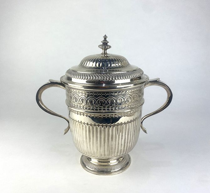 A late Victorian silver twin handle cup and cover, cover marked by Harris & Sons., London, 1897, shaped finial with gadrooned lid, the fluted body on pedestal foot, with repeating decorative band, height 26cm, 37.oz