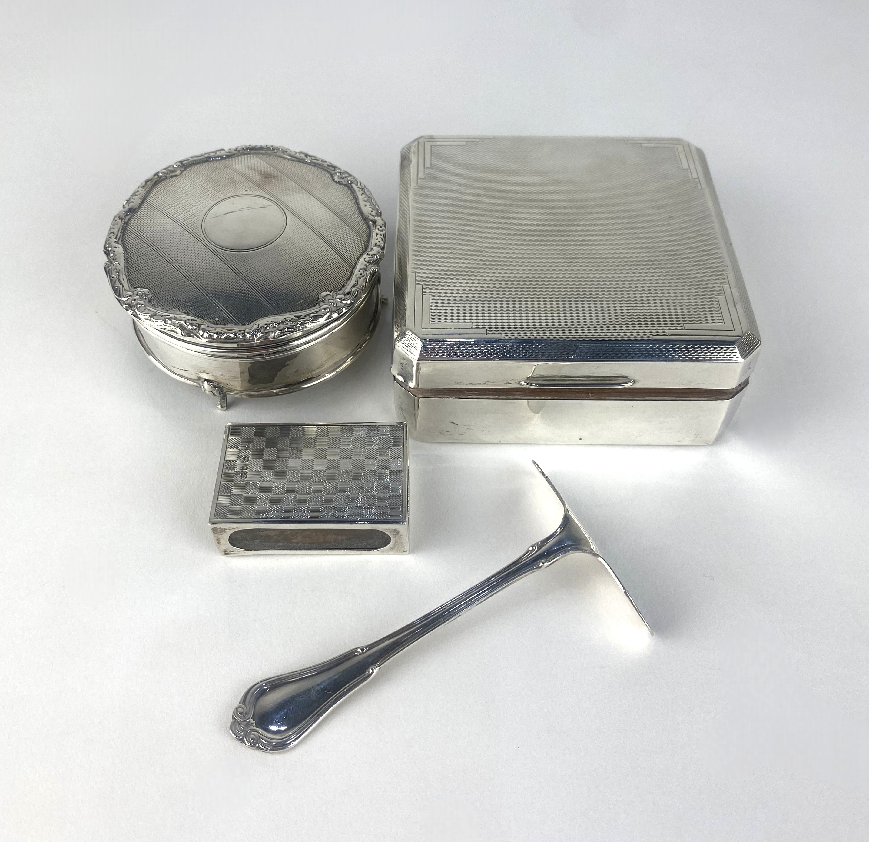 An Art Deco silver cigarette box, engine turned, marks worn, engraved to base 'Goldsmith's & Silversmiths's Co., 112 Regent St. W.', lined, width 8.7cm, together with a silver matchbox, with checkerboard design, London, 1930; a silver food pusher, Birmingham, 1932; a silver trinket box, of round form raised on three feet, Birmingham, 1934, depth 7.5cm(4)
