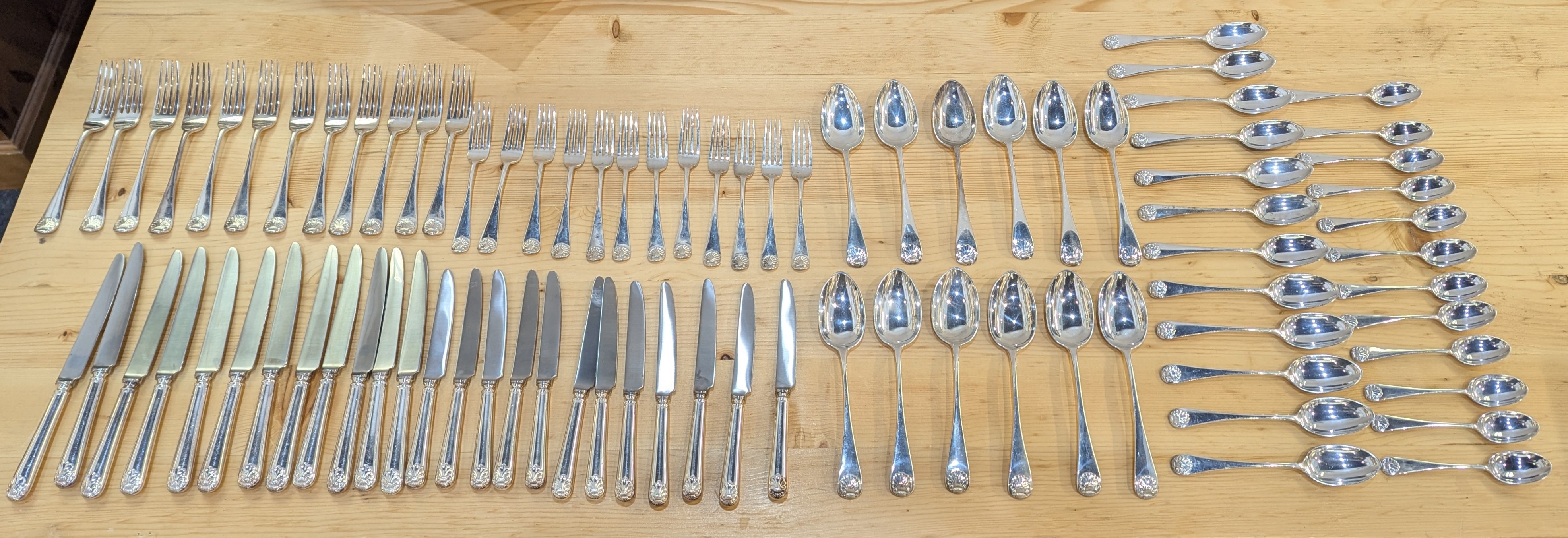 A large collection of Victorian and later silver flatware, each with scallop shell shaped terminal, various makers, the majority Charles Boyton, London, 1893, including; twelve table spoons, twelve dessert spoons, twelve teaspoons, twelve table forks, twelve dessert forks, twelve silver handled table knives, twelve silver handled dessert knives, gross total weight 170oz (84 pieces)