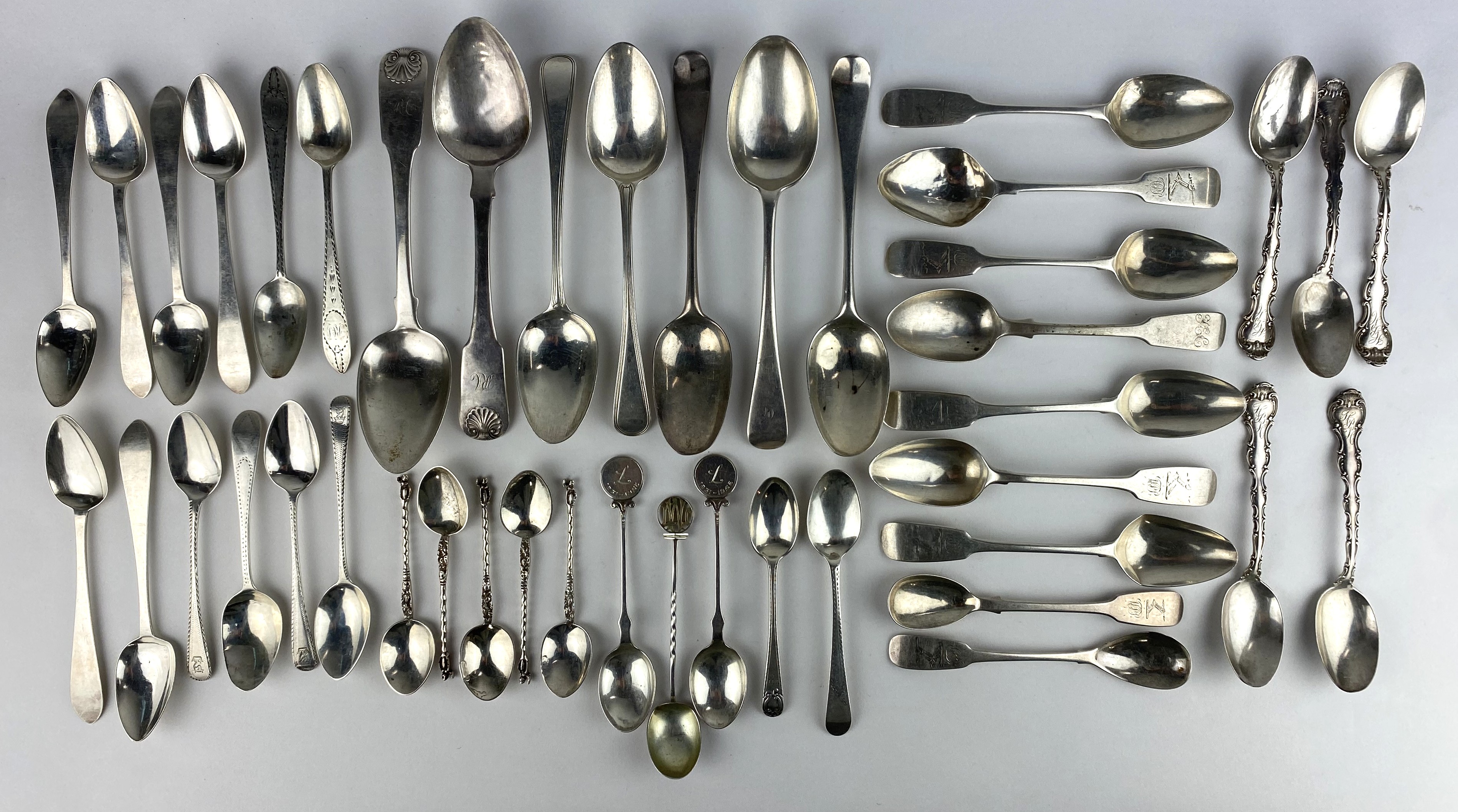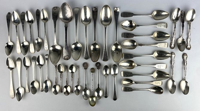 A collection of forty three silver spoon, English and Irish, mostly Georgian and Victorian, part sets and odds, combined weight 25 oz.