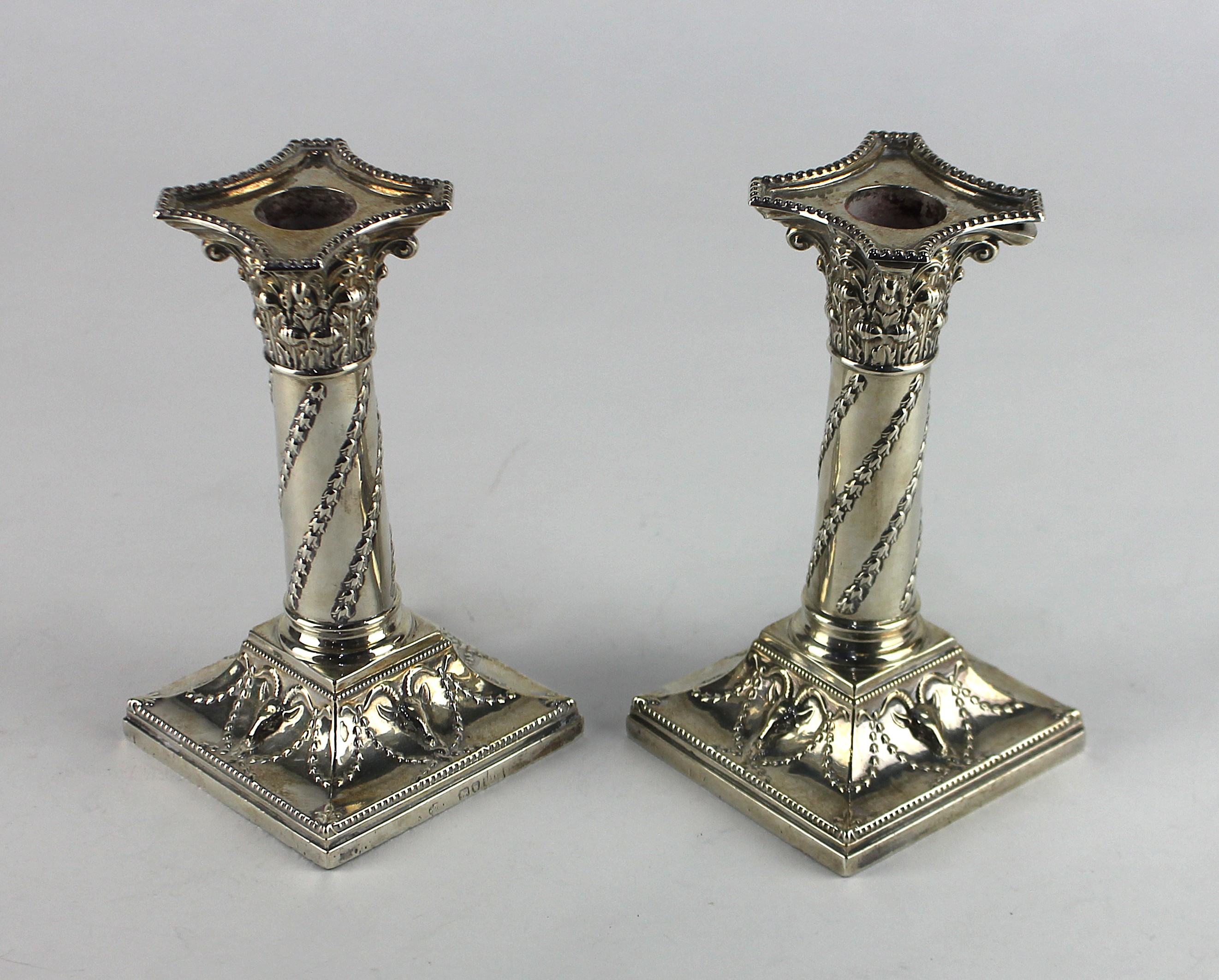 A pair of late Victorian silver candlesticks, by William Hutton & Sons Ltd., London, 1895, of Corinthian column form, embosse decorated with with garlands, the square base with ram's head motif, (weighted) height 15cm