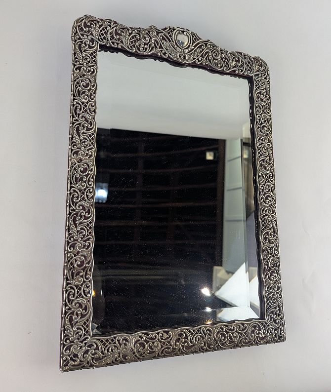 A large Victorian silver framed mirror of pierced scrolling design, Birmingham 1876, with rectangular bevelled mirror plate, 45.5cm by 30.5cm