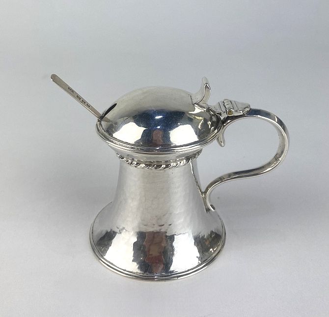 An Arts & Crafts silver mustard pot and mustard spoon by Omar Ramsden, George V, London, 1922, pot of capstan shape, with domed cover, planished decoration, scroll shaped handle, rope twist detail, with original glass liner, together with matching spoon, height 7.5cm, 3oz