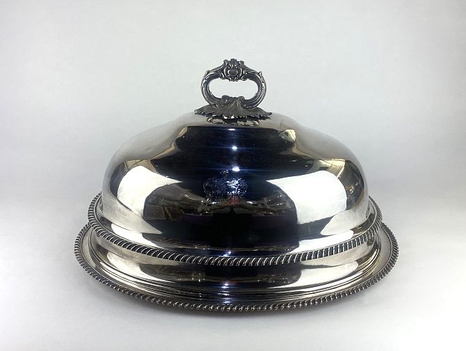A large Wilcox 'Ashley' pattern EPNS meat dome on stand, with gadrooned borders and engraved armorial, approx 39cm high
