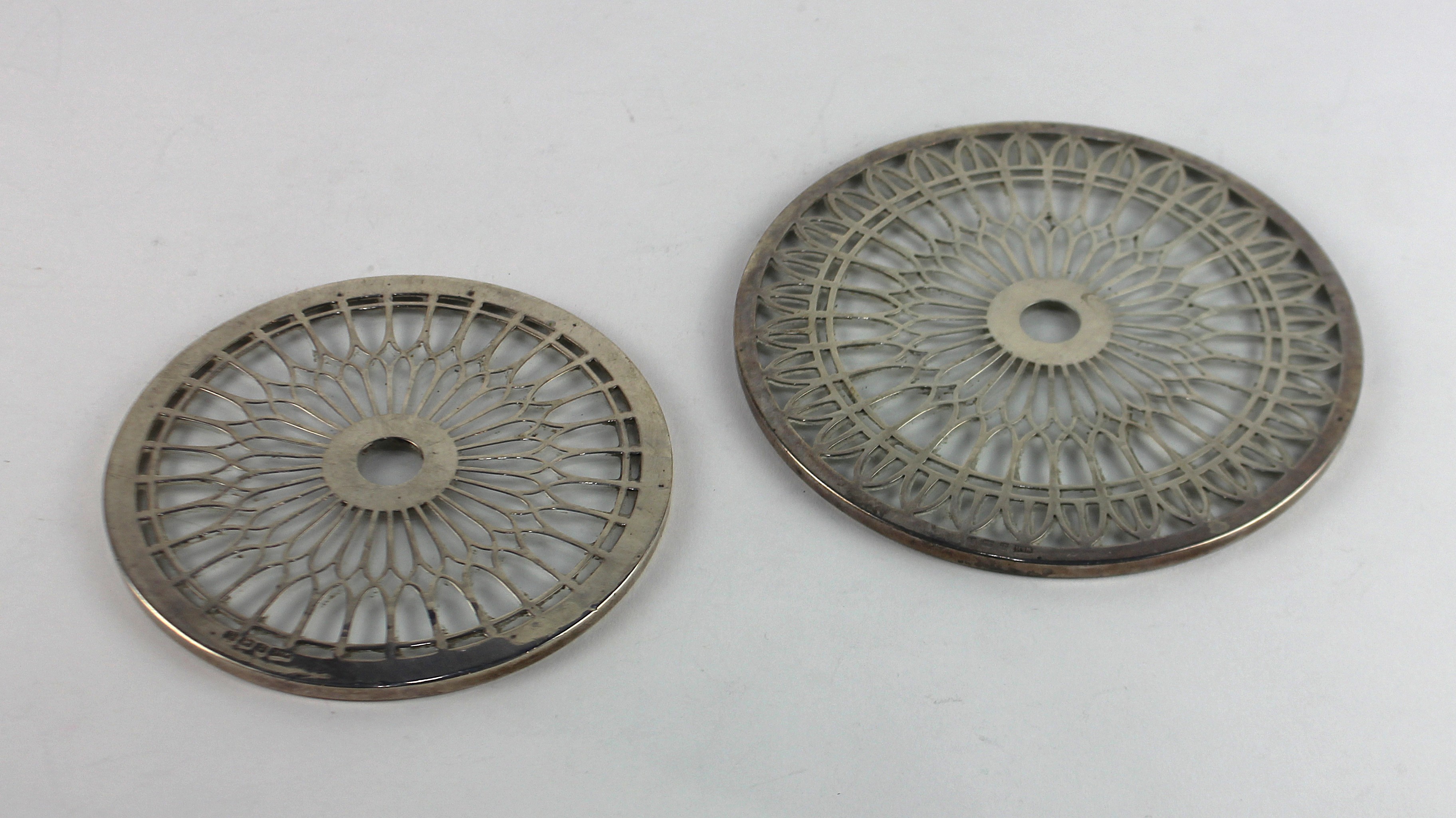 Two George V silver and glass teapot stands or trivets, by Walker & Hall, Birmingham, 1929, 15.2cm and 12.6cm diameter (2)