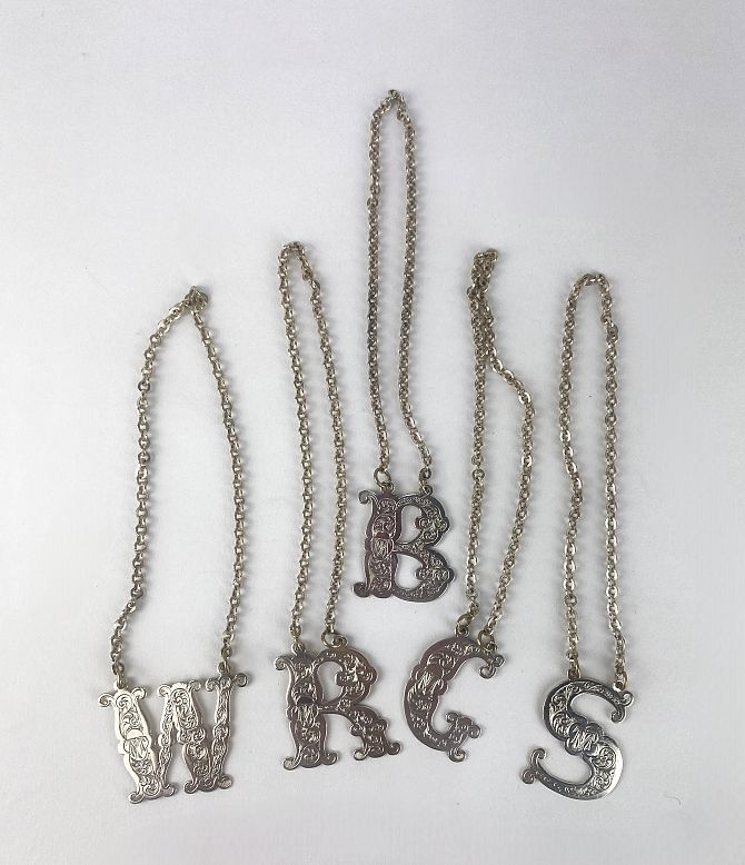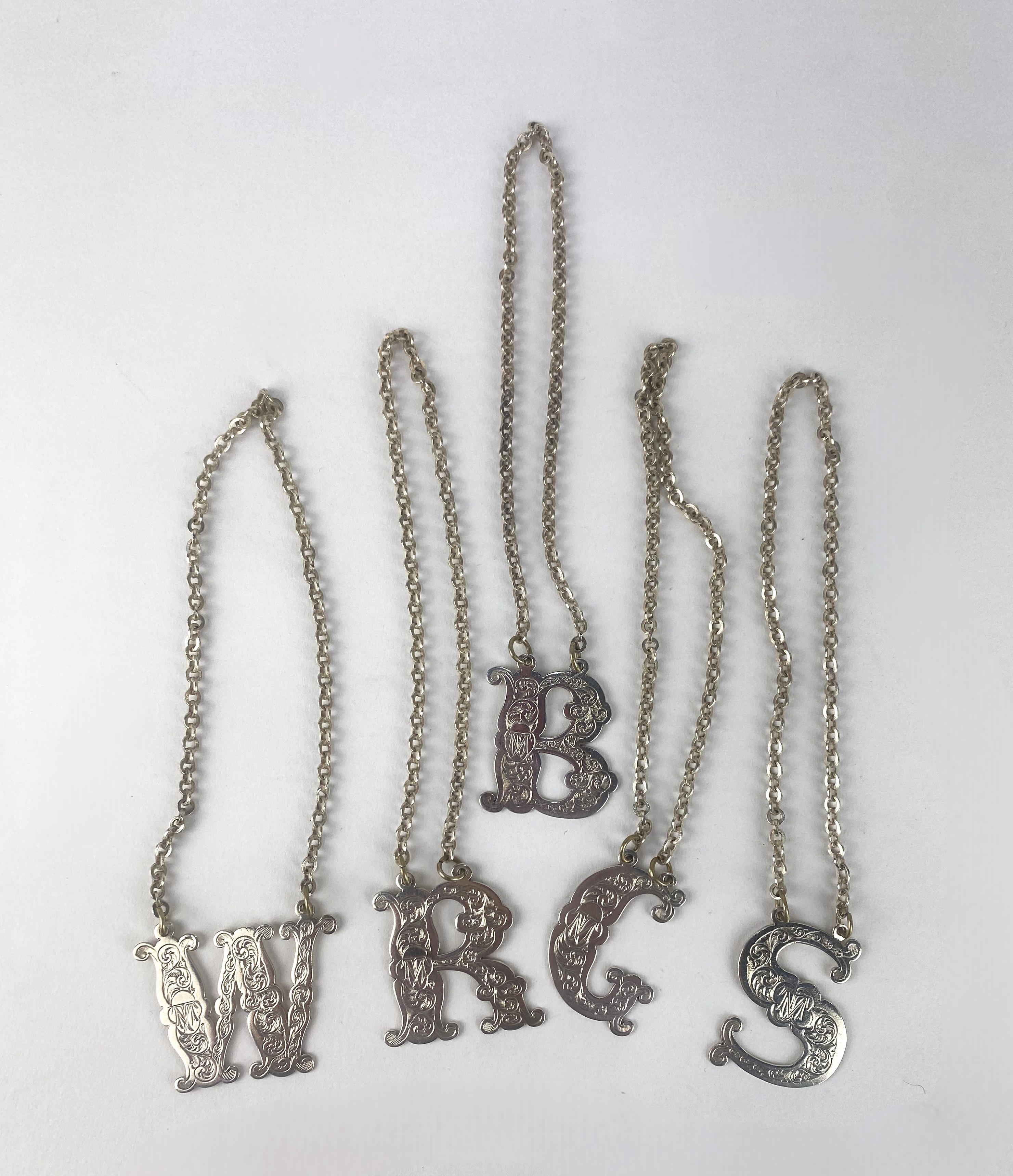 A set of five Victorian silver decanter labels, by Walker & Hall (John Edward Bingham), Sheffield, 1874, each on white metal chains, engraved with scroll motif and bearing monogram, including 'W', 'S', 'B', 'G' and 'R', 3.7cm high, gross total weight 1.9oz (5)