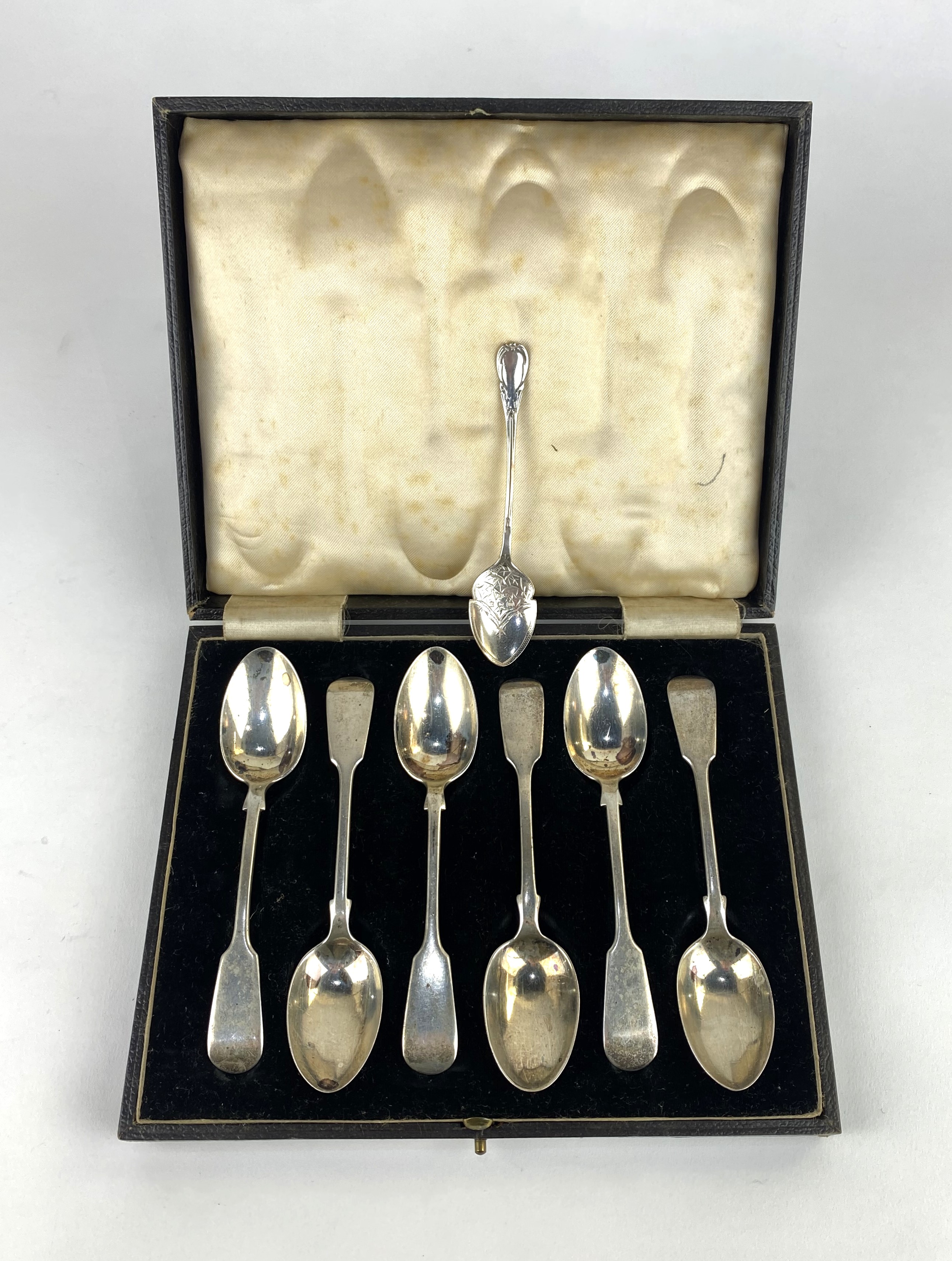A late Victorian case set of six silver fiddle pattern spoons, by John Round & Son Ltd., Sheffield, 1896, length 14.5cm, together with a silver preserve spoon, by Joseph Gloster Ltd.,Birmingham, shaped bowl engraved with leaf motif, 1911, boxed, length 11.6cm, total weight approximately 5.4oz