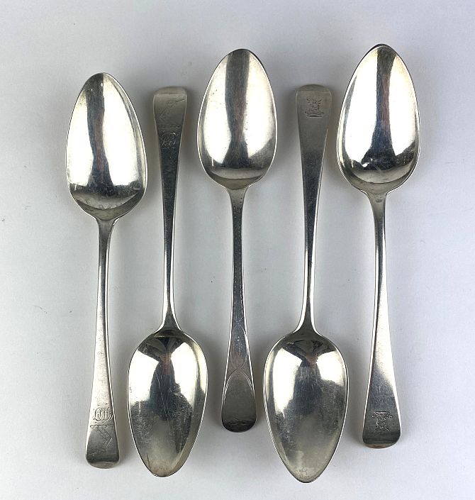 Two pairs of George III silver serving spoons, London 1797 and London 1794, together with a single George III silver bright cut serving spoon, London 1805, combined weight 10.26 oz, (5).