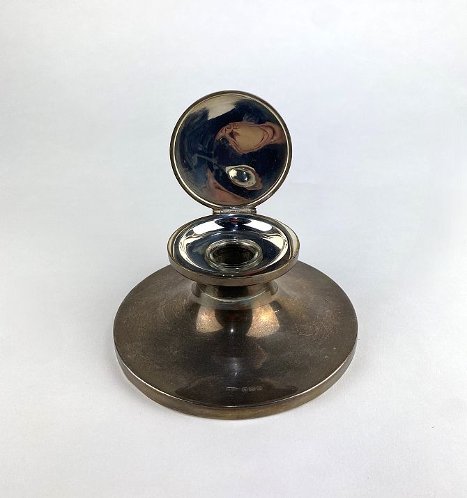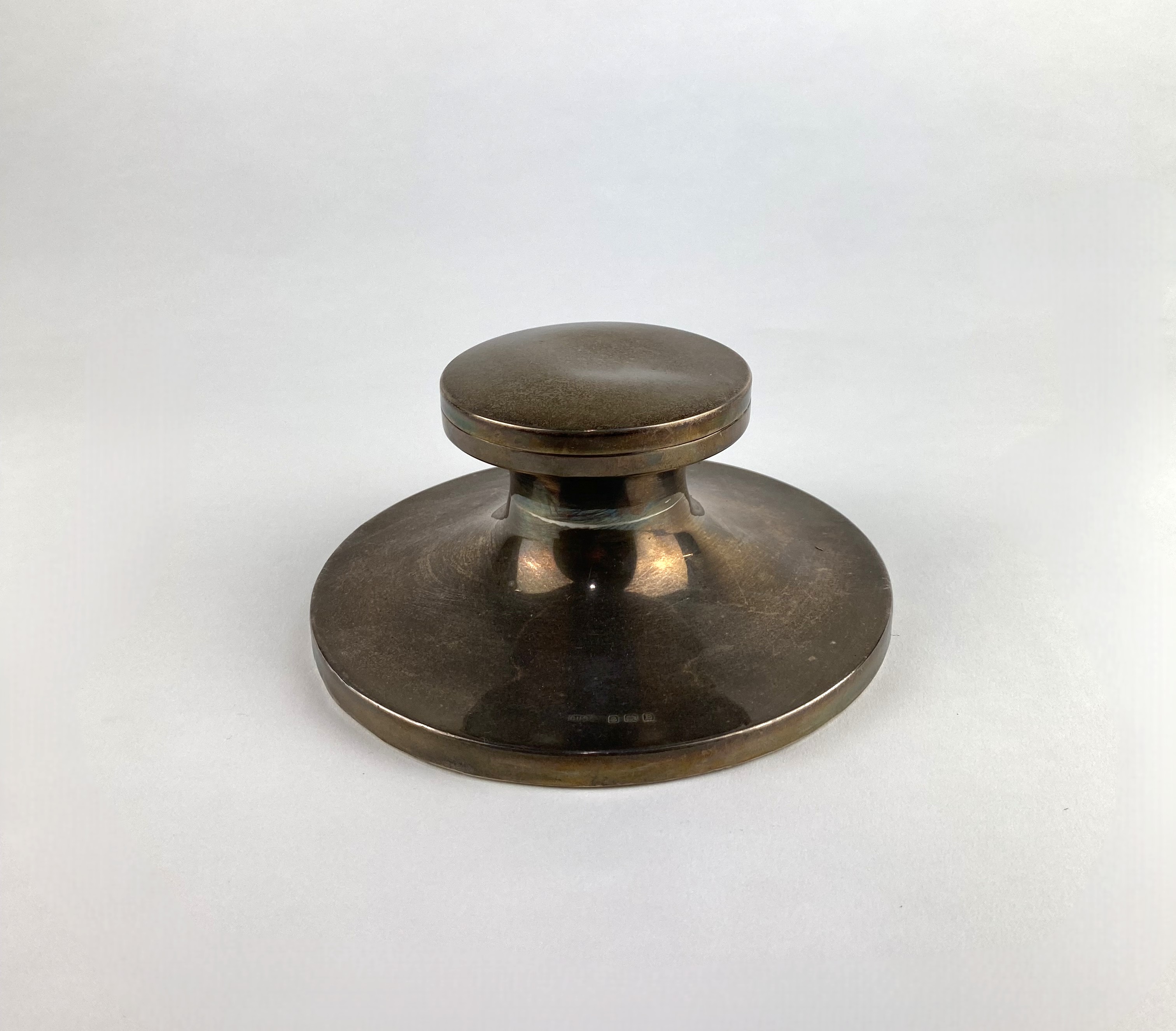 A George V large silver capstan inkwell, by G. Unite & Sons & Lyde Ltd, Birmingham, 1929, weighted, diameter 13.7cm (AF)
