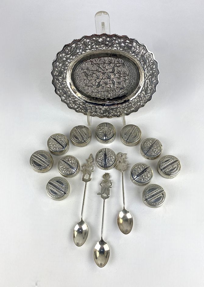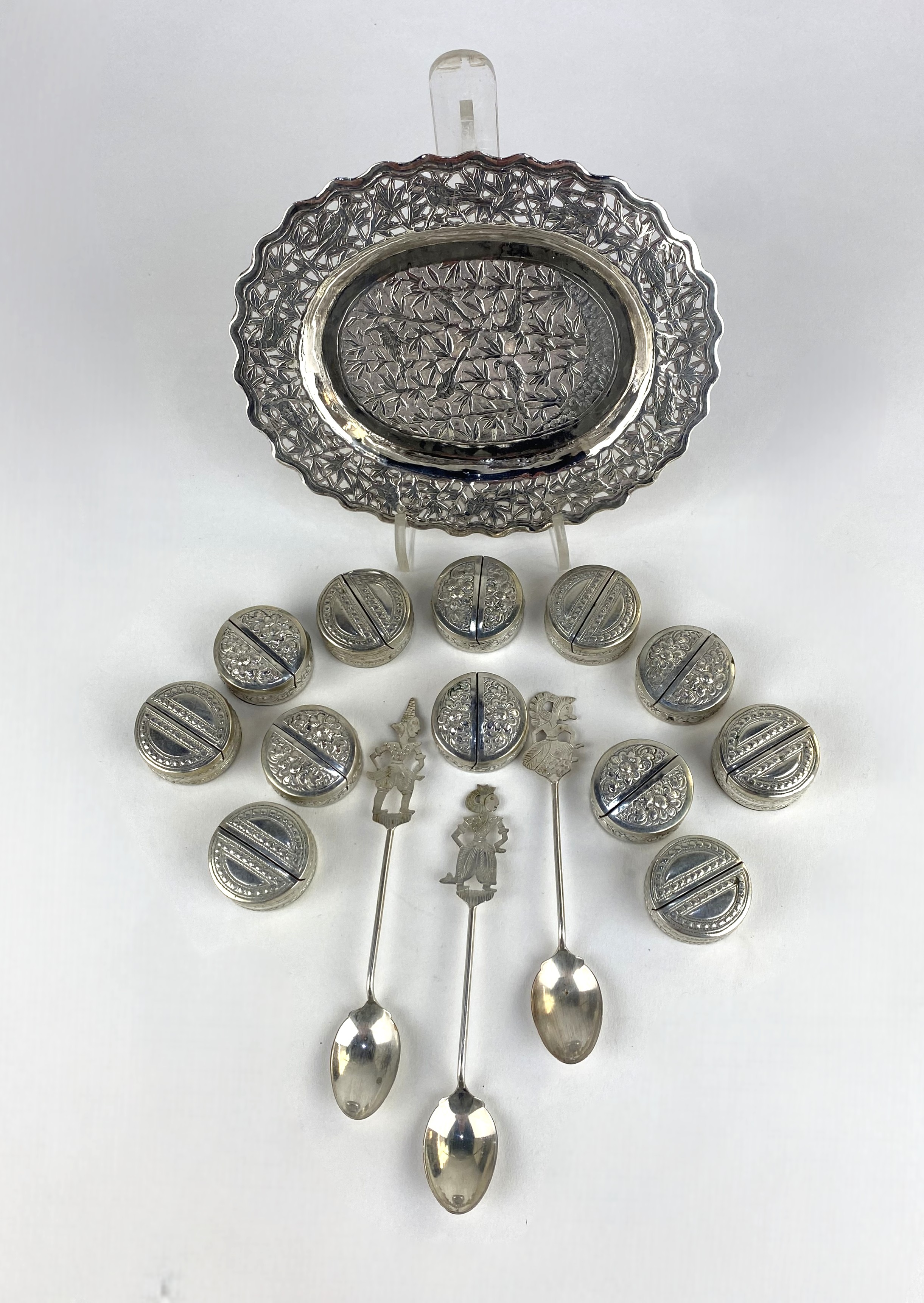 A collection of twelve Cambodian white metal place setting holders, each repousse decorated, marked 'Cambodge 900', each 2.8cm (two AF); an Asian white metal tray, with pierced rim repousse decorated with leaf and bird motif, length 13.7cm, and three Asian souvenir teaspoons, each with pierced figural terminal, stamped '1260' (16 items)