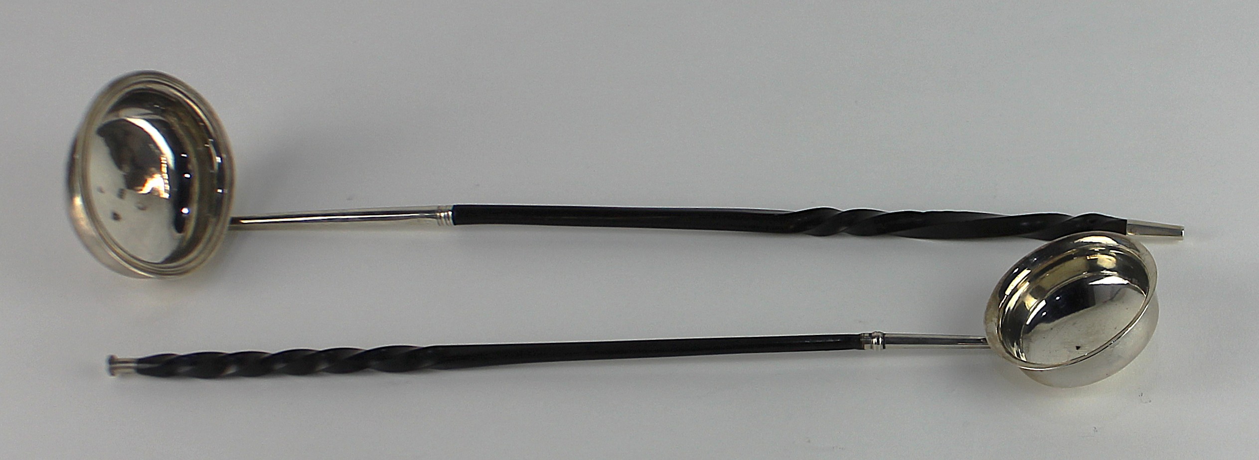 A George III Scottish silver ladle, Edinburgh, 1808, maker 'H.I' with twisted baleen handle, oval bowl with reeded rim, length 38cm, together with a Georgian toddy ladle with white metal bowl and twisted baleen handle, length 33cm