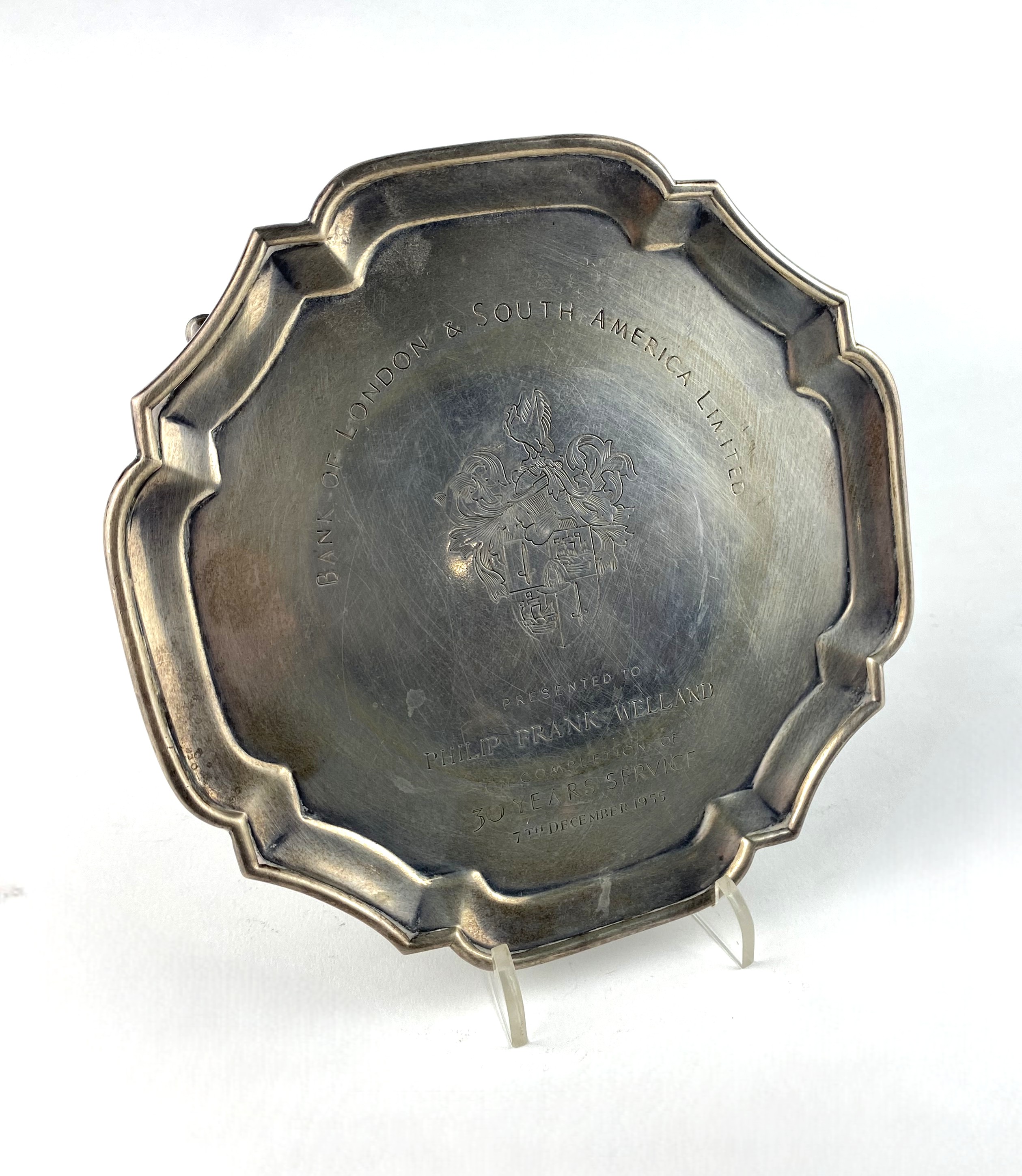 An Elizabeth II silver card tray in a Chippendale style, with engraced presentation inscription 'Bank of London & South America Ltd, Presented to Philip Frank Welland on completion of 30 years service 7th December 1955', London 1955, 15cm wide, 6.18 oz.