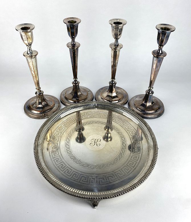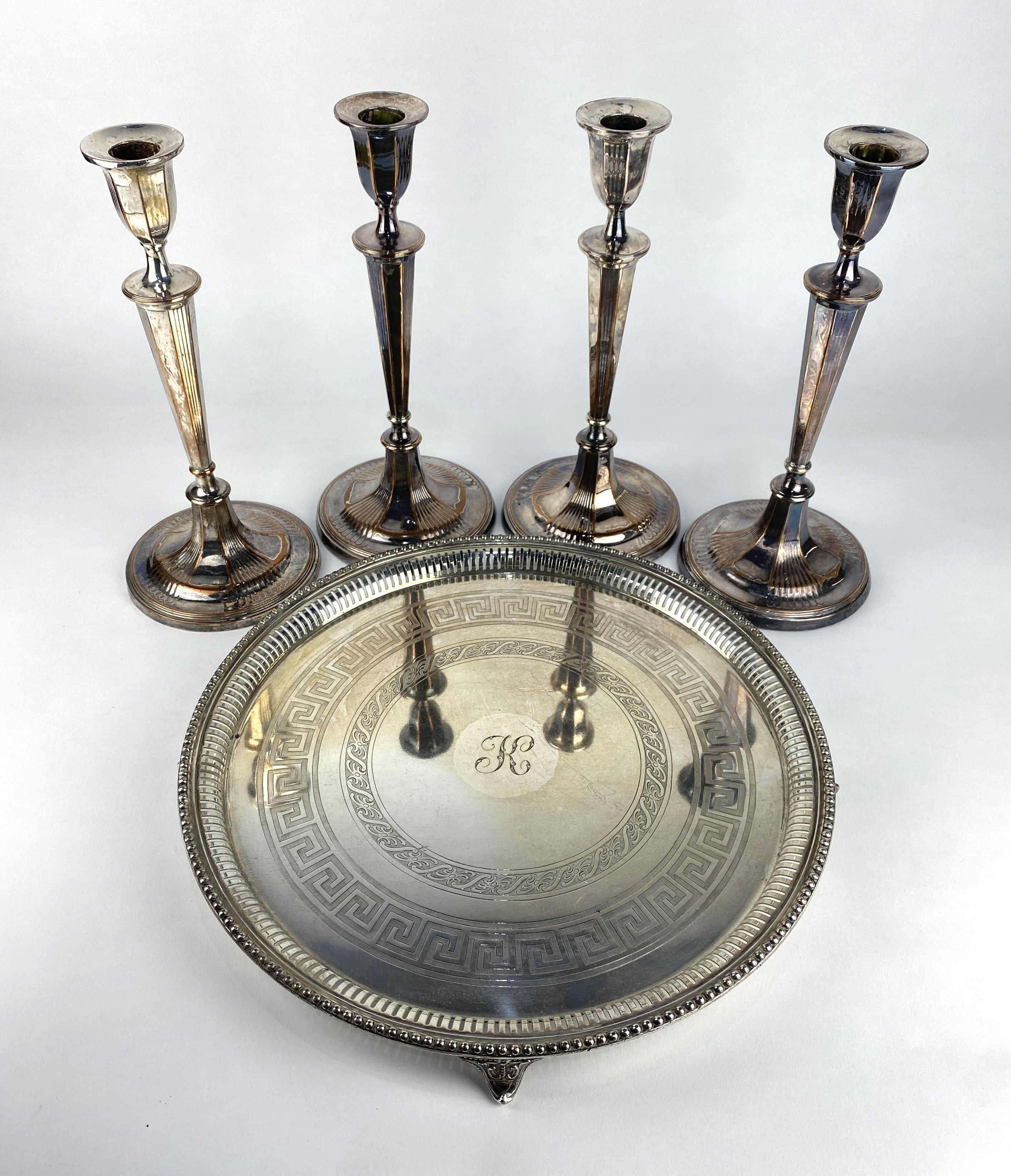 A set of four silver plated candlesticks each on tapered faceted stem to circular foot 30cm high, together with an EPNS circular salver with pierced border and Greek key design, monogram engraved, 36cm diameter