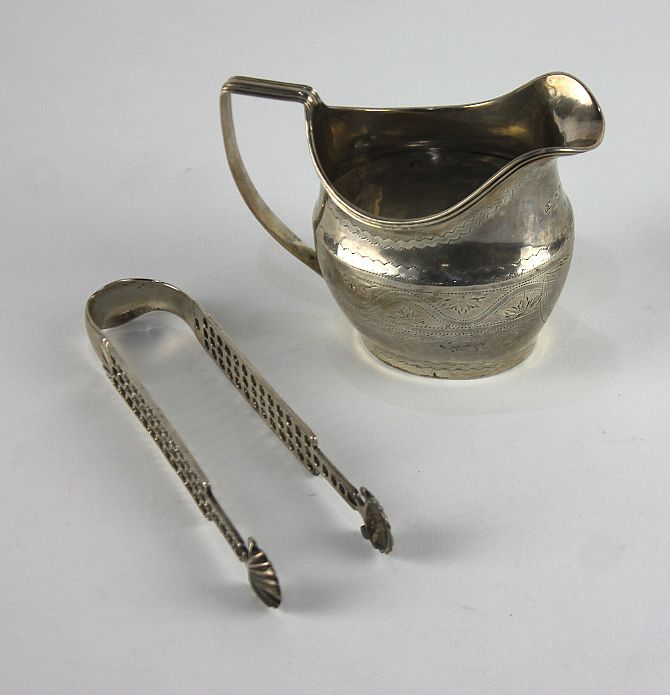 A pair of George III silver sugar tongs, late 18th century, with pierced decoration and shell form bowls, marked 'RM' (lacking town mark and date letter), together with a George III silver cream jug, London, 1807, maker I.M (possibly John Merry), with reeded rim and handle, engraved with floral motif, height 8cm , total weight 3.4oz